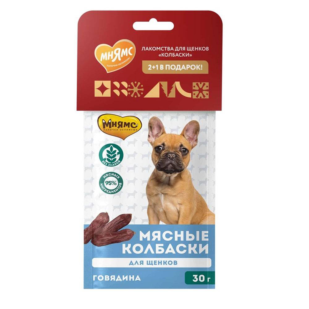 Мнямс мягкие колбаски с говядиной для щенков. Колбаски «Мнямс»- это вкусное и здоровое лакомство с большим содержанием мяса, которое придется по вкусу даже самому капризному любимцу. Мягкие колбаски специально созданы для щенков, идеально подходят в качестве поощрения для игр и первых тренировок.