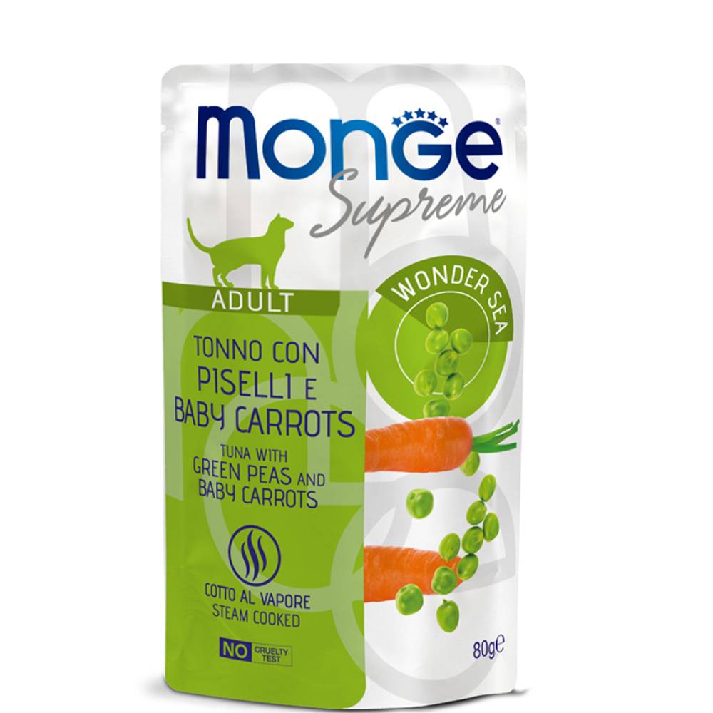 Влажный корм Monge Supreme Adult cat для взрослых кошек с зелёным горошком и мини-морковью, паучи 80 гр.