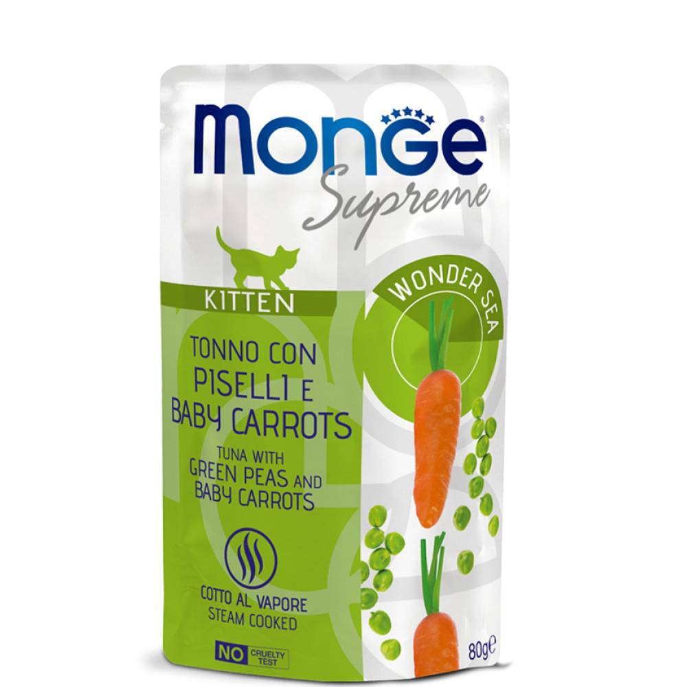 Влажный корм Monge Supreme kitten для котят из тунца с зелёным горошком и мини-моркови, консервы 80 гр.