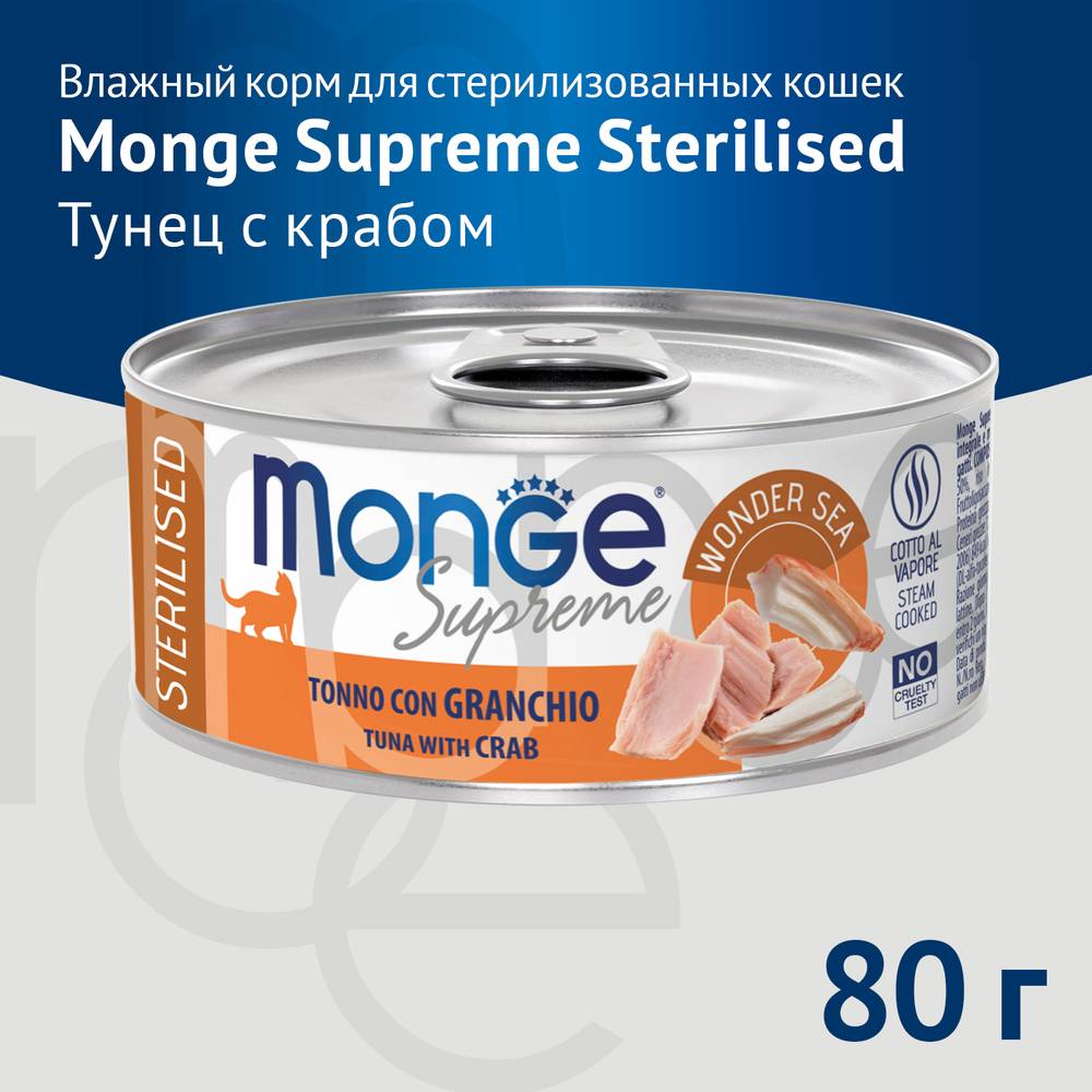 Влажный корм Monge Supreme Sterilised для стерилизованных кошек из тунца с крабом , консервы 80 гр.