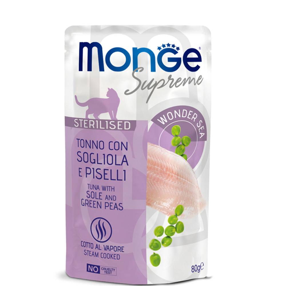 Влажный корм Monge Supreme sterilized cat тунец с желтоперой камбалой и зелёным горошком 80 г. Дополнительный консервированный корм для стерилизованных кошек.