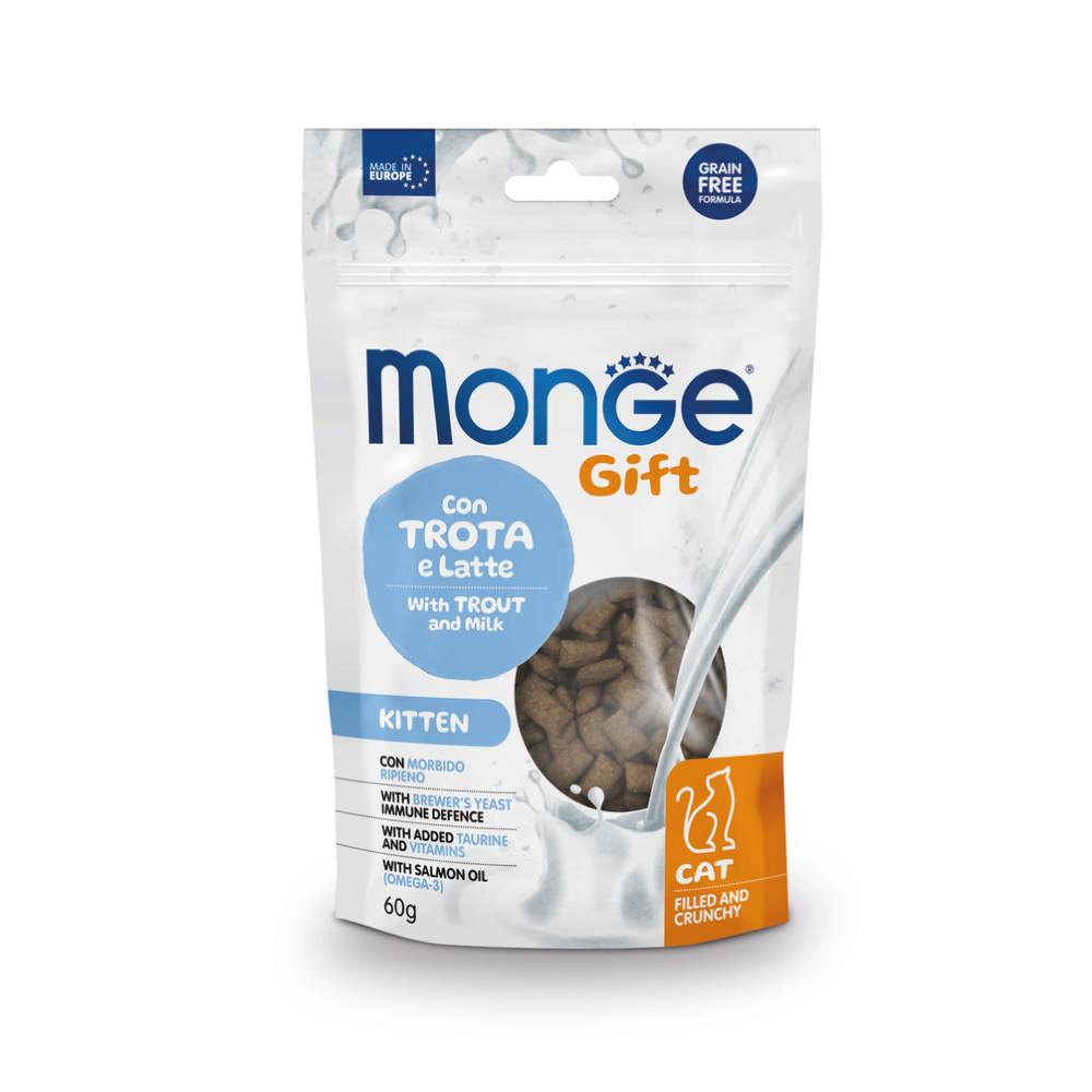 MONGE GIFT KITTEN для котят с форелью и молоком — это дополнительное питание для подрастающих котят. Разработан специально для хорошего самочувствия вашего котенка: наружный хрустящий слой поддерживает гигиену полости рта, а мягкая начинка с молоком служит источником минералов для роста.