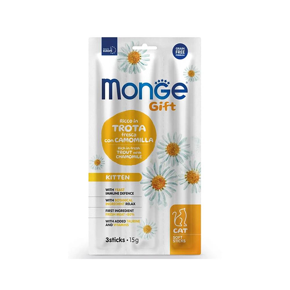 MONGE GIFT KITTEN для котят с высоким содержанием свежей форели с ромашкой — это дополнительное питание для подрастающих котят. Разработан специально для хорошего самочувствия вашего котенка: дрожжевые продукты в составе укрепляют иммунитет, а низкое содержание жира* позволяет поддерживать оптимальную массу тела в период роста.