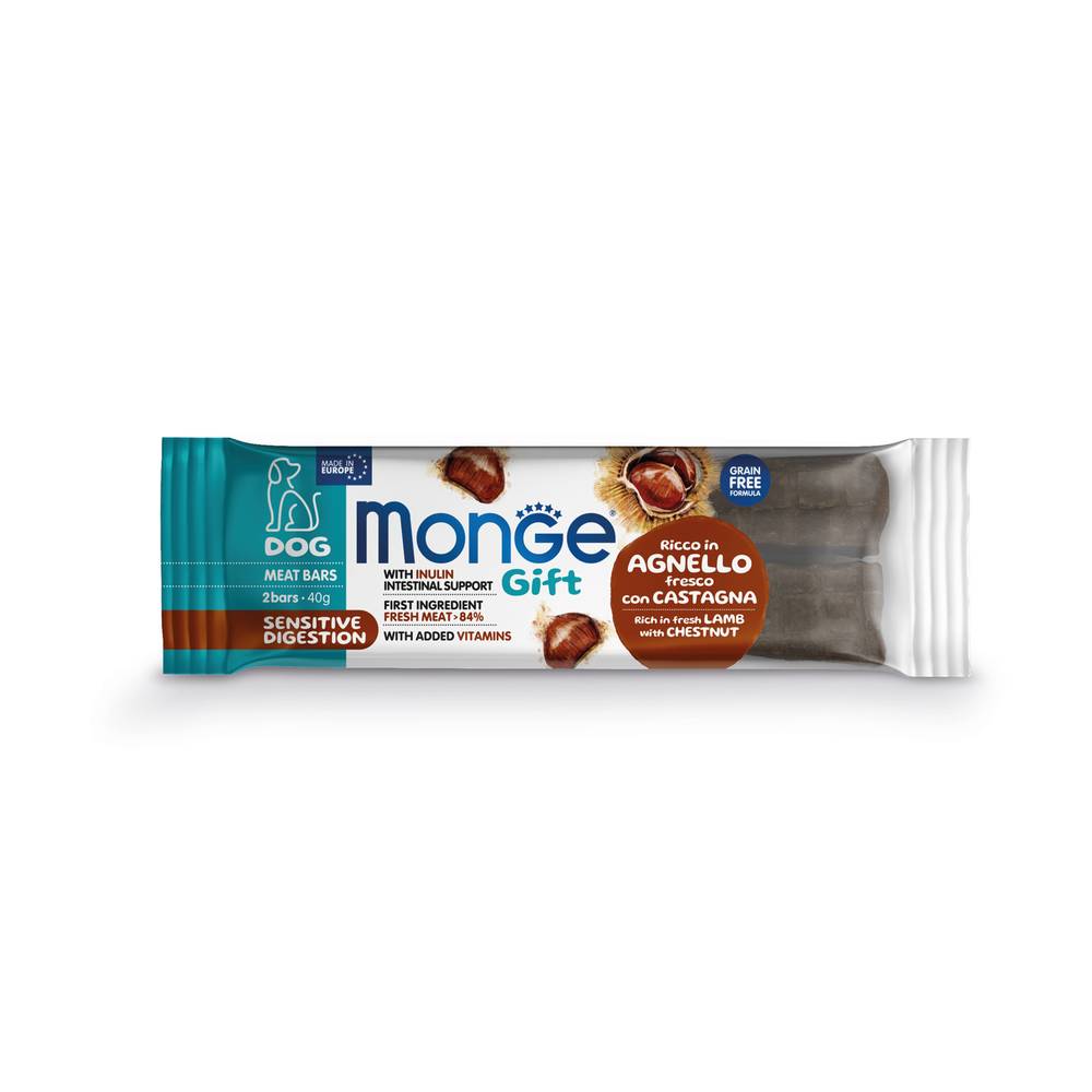 MONGE GIFT для собак с чувствительным пищеварением со свежим мясом ягненка, каштаном и инулином – это дополнительное питание для взрослых собак. Разработан специально для поддержания
