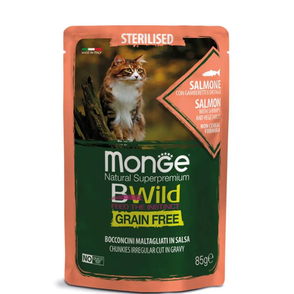 Monge (Монж) Cat BWild GRAIN FREE (холистик) полнорационные беззерновые паучи из лосося с креветками и овощами для стерилизованных кошек и кастрированных котов 85 г.