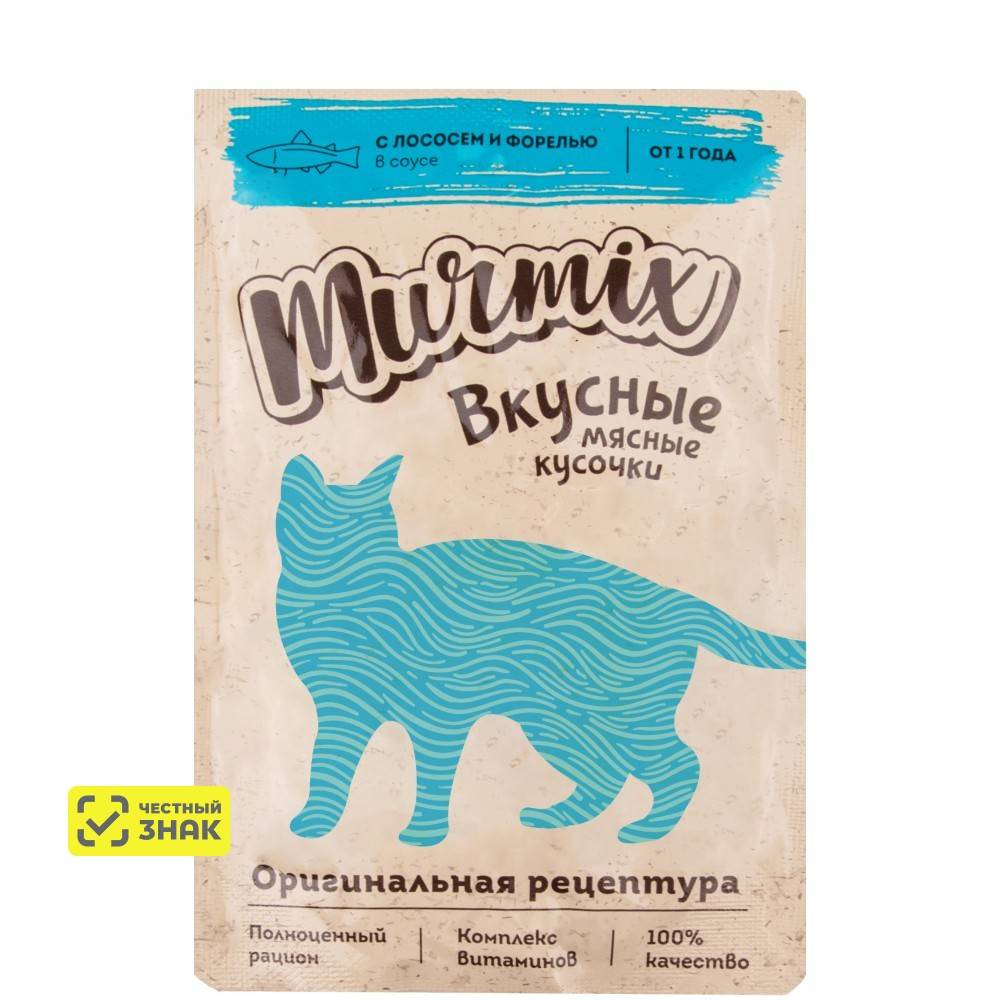 Murmix Влажный корм (пауч) для взрослых кошек, кусочки лосося с форелью в соусе, 85 гр.