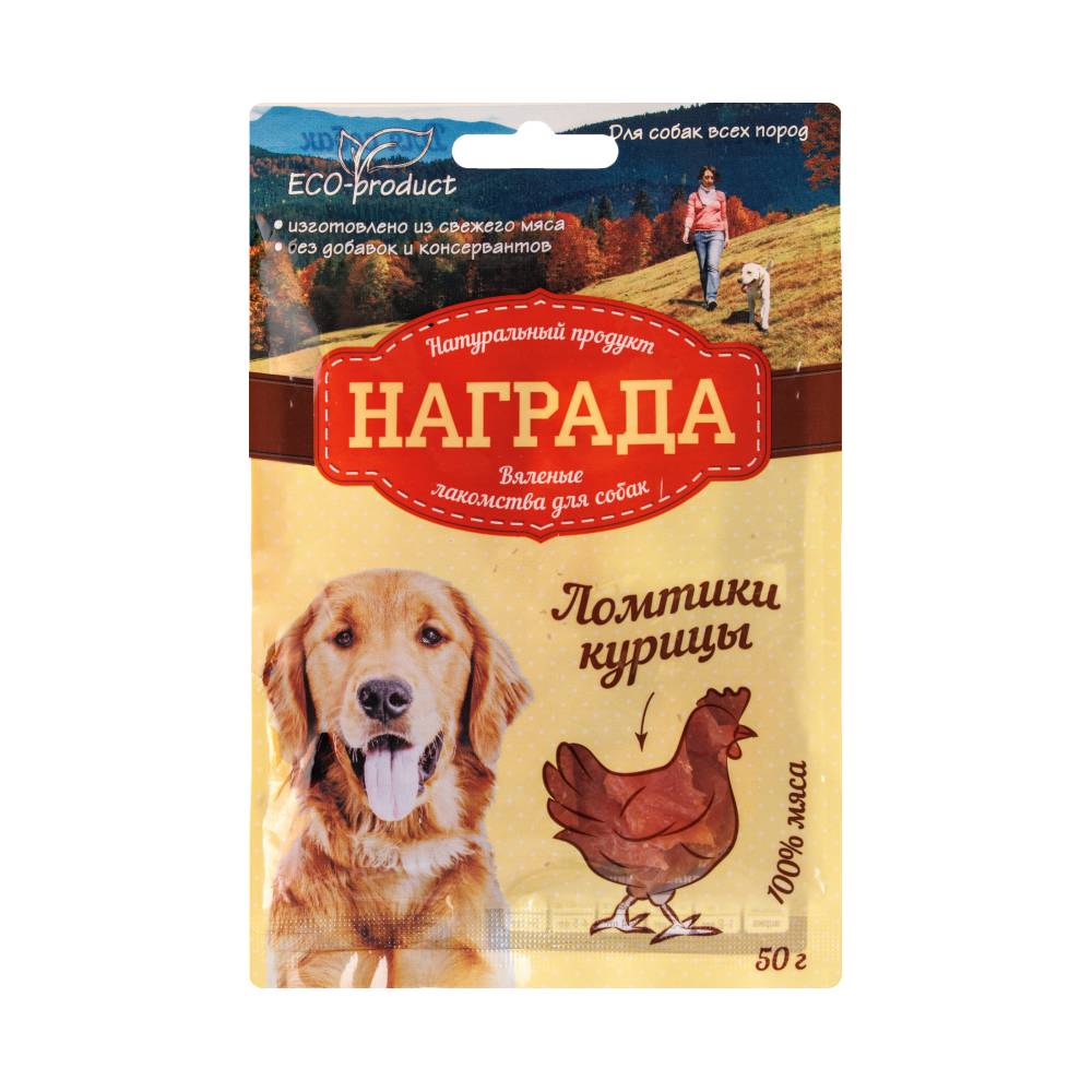 Награда Лакомство для собак Вяленые ломтики курицы - отличный вариант когда хочется порадовать своего питомца вкусным и полезным угощением. Преимущества: Вяленые лакомства Награда произведены на 100% из свежего натурального мяса без добавления красителей и консервантов. Они отлично дополнят рацион питомца и разнообразят меню. Лакомства удобно брать с собой на прогулку и использовать при дрессировке. Вкусные волокна подойдут для мелких пород собак.