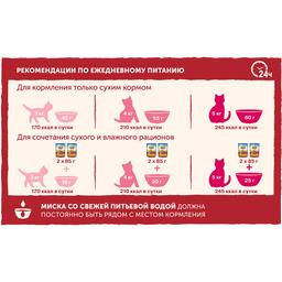 Хранить при температуре от + 4*С до + 35*С и относительной влажности воздуха не более 75 %. Nature’s Table™. Полнорационный корм, предназначенный только для взрослых кошек. Рекомендации по ежедневному питанию: 1. Для кормления только сухим кормом: - масса кошки 3 кг – 45 г (170 ккал в сутки); - масса кошки 4 кг – 55 г (210 ккал в сутки); - масса кошки 5 кг – 60 г (245 ккал в сутки). 2. Для сочетания сухого и влажного рационов: - масса кошки 3 кг – 10 г сухого и 2 пакетика влажного корма по 85 г (170 ккал в сутки); - масса кошки 4 кг – 20 г и 2 пакетика влажного корма по 85 г (210 ккал в сутки); - масса кошки 5 кг – 25 г и 2 пакетика влажного корма по 85 г (245 ккал в сутки). Миска со свежей питьевой водой должна постоянно быть рядом с местом кормления.