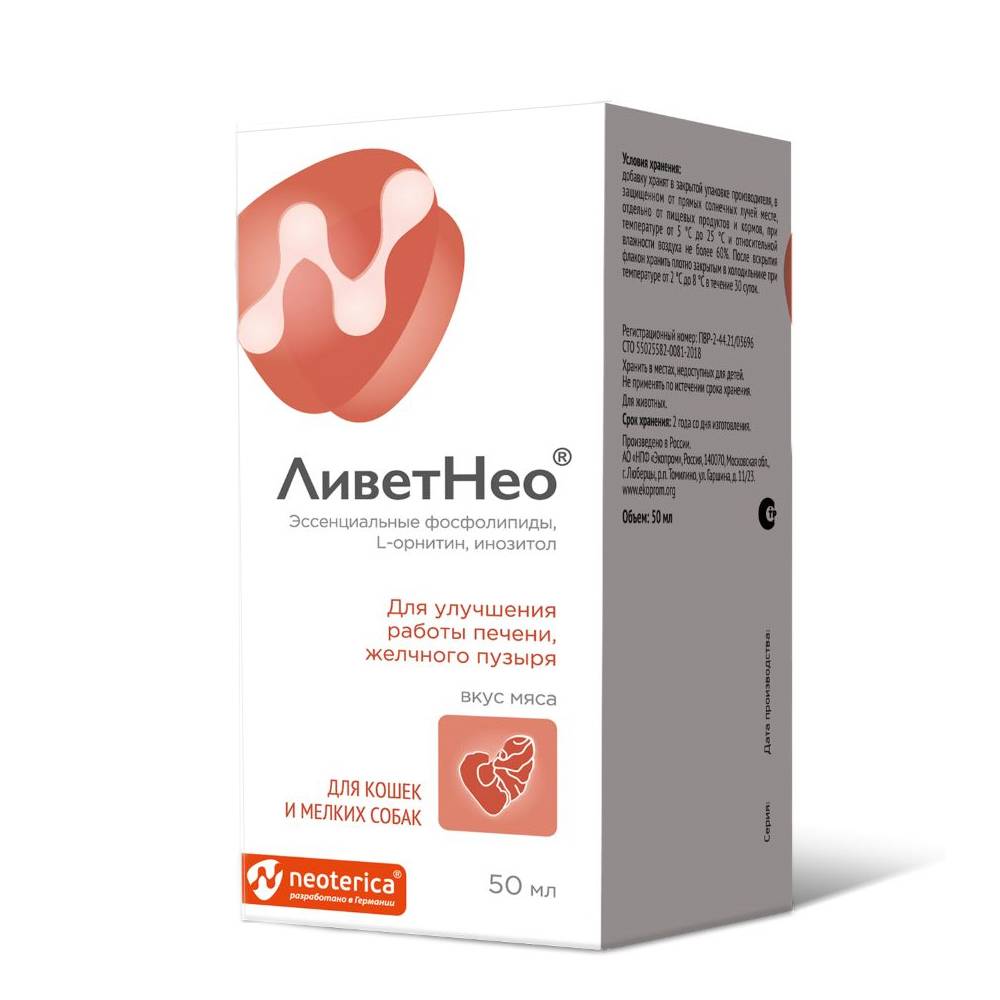ЛиветНео – кормовая добавка для нормализации и улучшения работы печени, желчного пузыря на основе эссенциальных фосфолипидов с приятным ароматом и вкусом мяса.