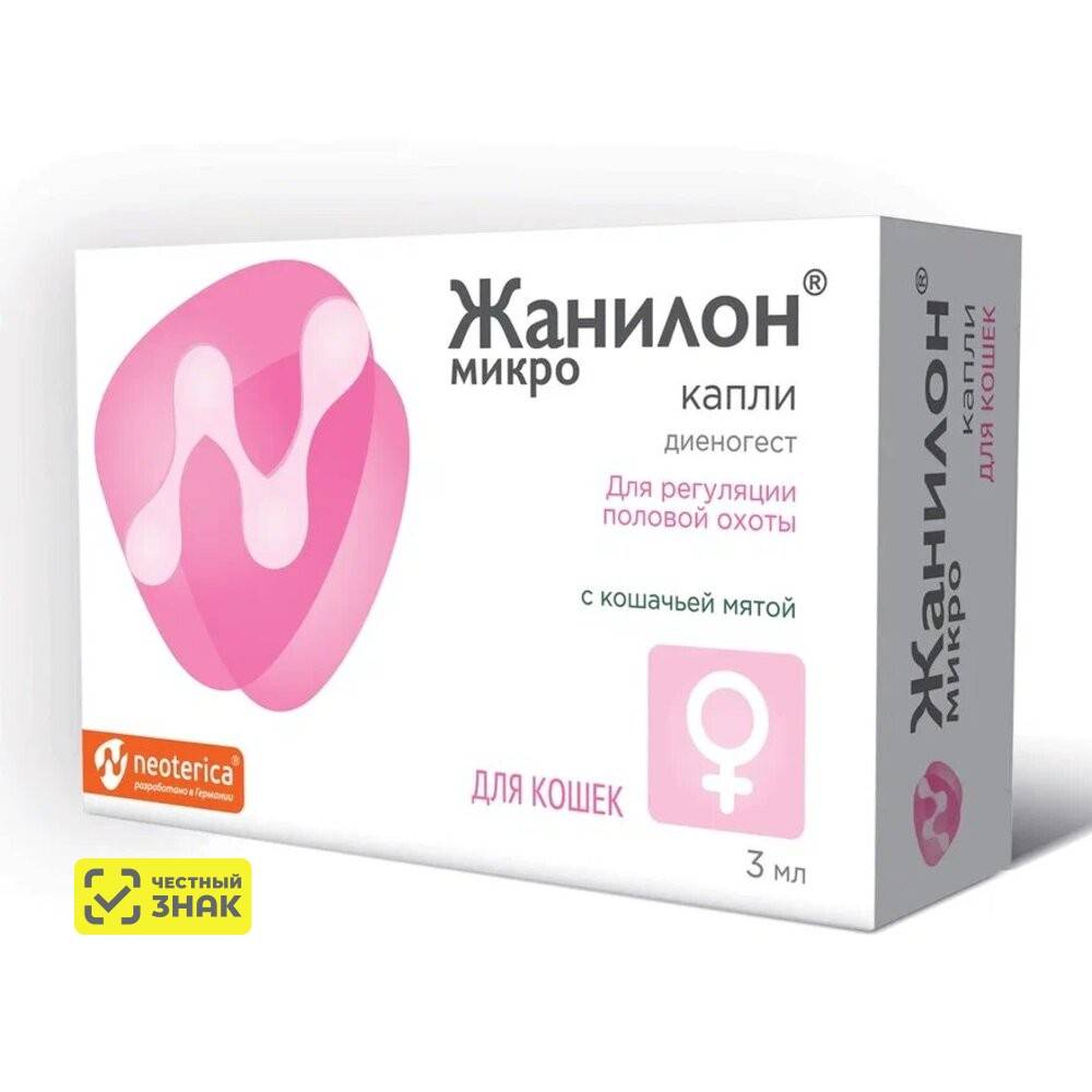 — для прерывания течки при появлении ее первых признаков, но не позднее чем через 2 дня от ее начала, а также для коррекции поведения в дозе 6 капель для животных массой тела до 5 кг в течение 4–7 дней до исчезновения признаков течки плюс один день с интервалом 24 часа;