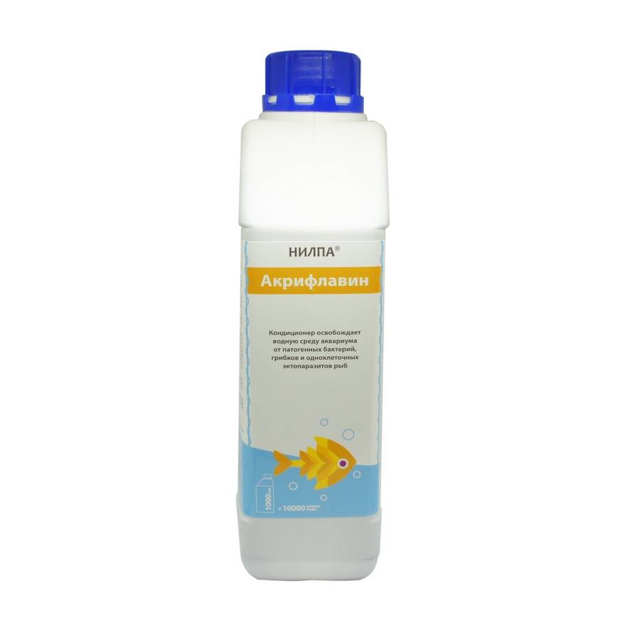 Применение кондиционера НИЛПА®«Акрифлавин» делает водную среду безопасной для рыб, так как он препятствует размножению и расселению болезнетворных организмов. Кондиционер можно с осторожностью использовать в аквариумах с растениями (нежные виды могут пострадать) и с водными беспозвоночными, такими как улитки, креветки-фильтраторы и креветки Амано.