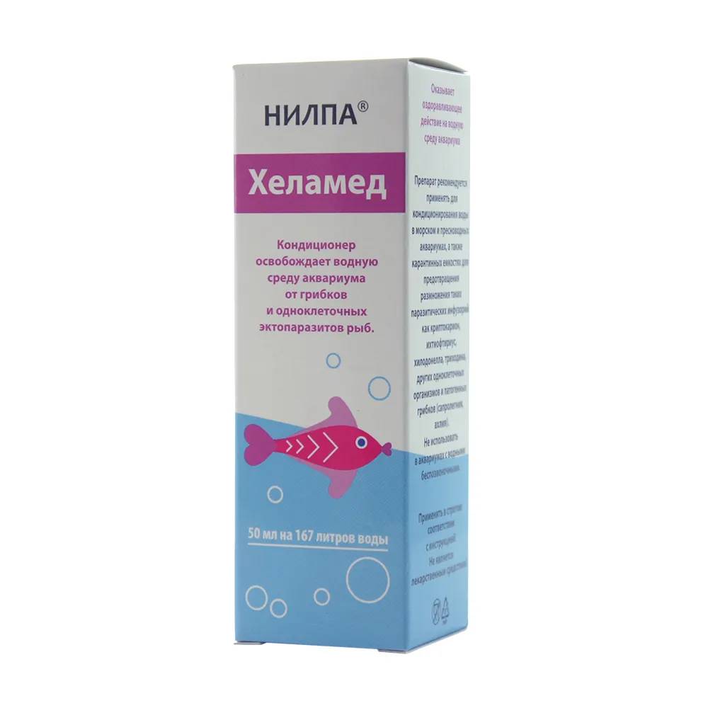 Кондиционер Хеламед от грибков и экзопаразитов в аквариумной воде оказывает оздоравливающее действие на водную среду. Кондиционер препятствует размножению в аквариуме паразитических инфузорий, таких как ихтиофтириус, хилодонелла, триходина, а также криптобий, амеб, патогенных грибков (сапролегния, ахлия).