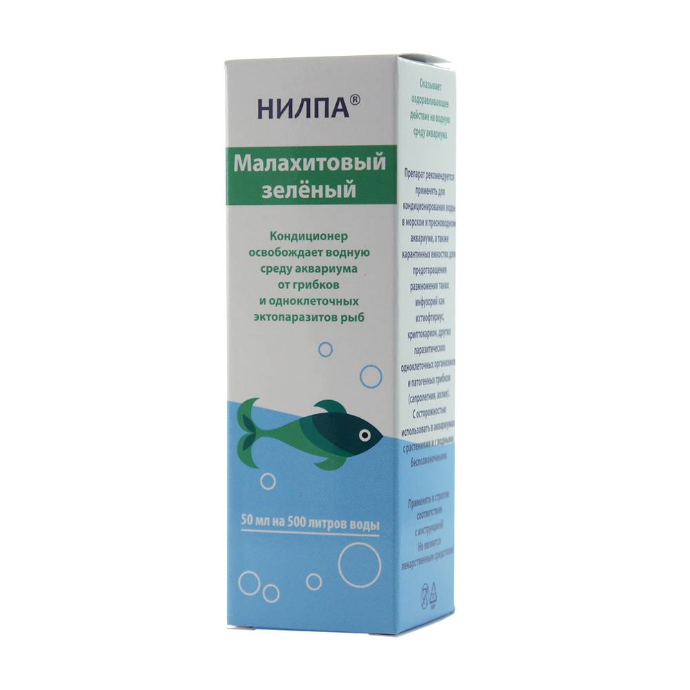 Применение малахитового кондиционера Нилпа делает водную среду безопасной для рыб, так как он препятствует размножению и расселению болезнетворных организмов.