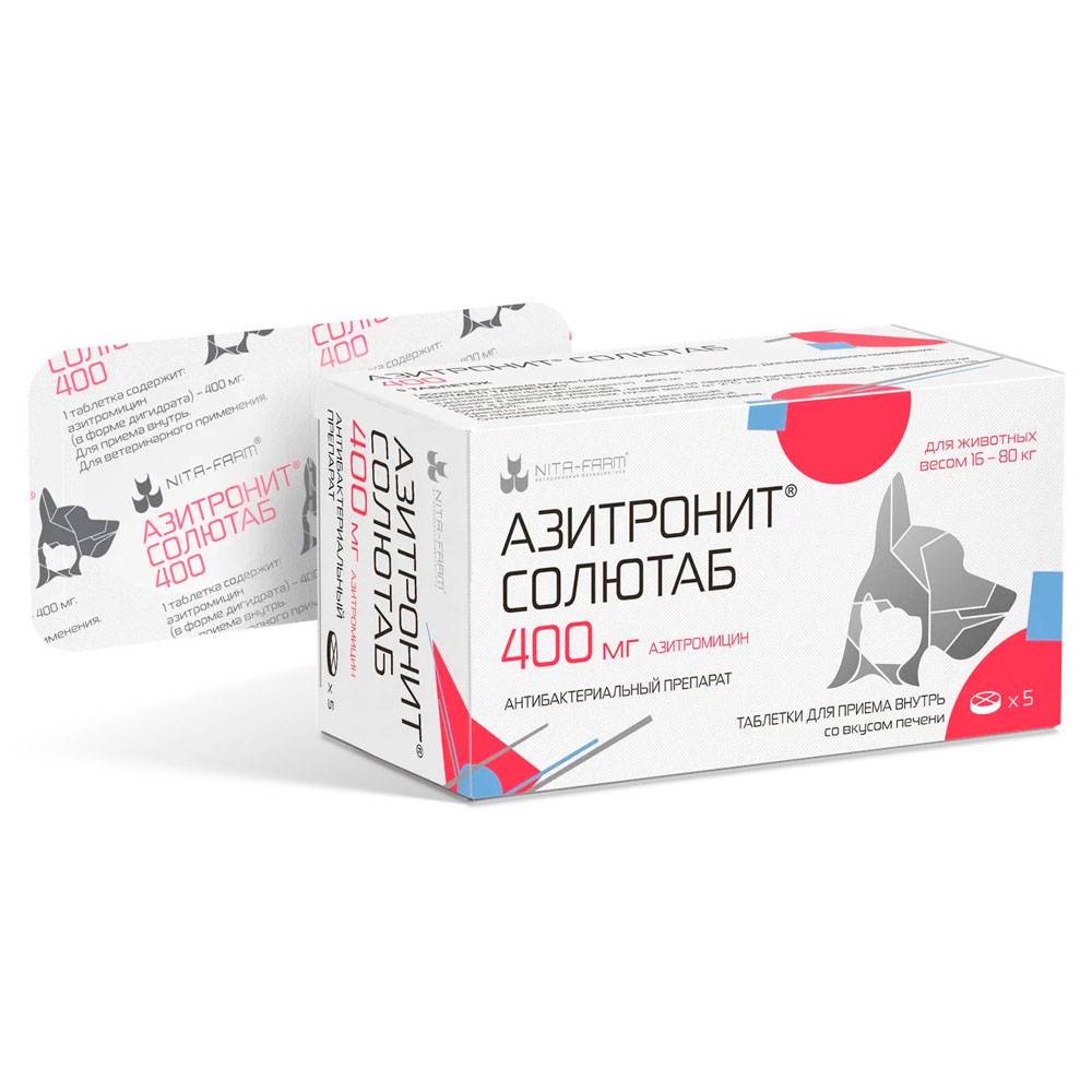 Азитронит® Солютаб применяют кошкам и собакам для лечения бактериальных инфекций органов дыхания, мочеполовой системы, инфекций кожи и мягких тканей, а также инфекций, вызываемых микроорганизмами, чувствительными к азитромицину.