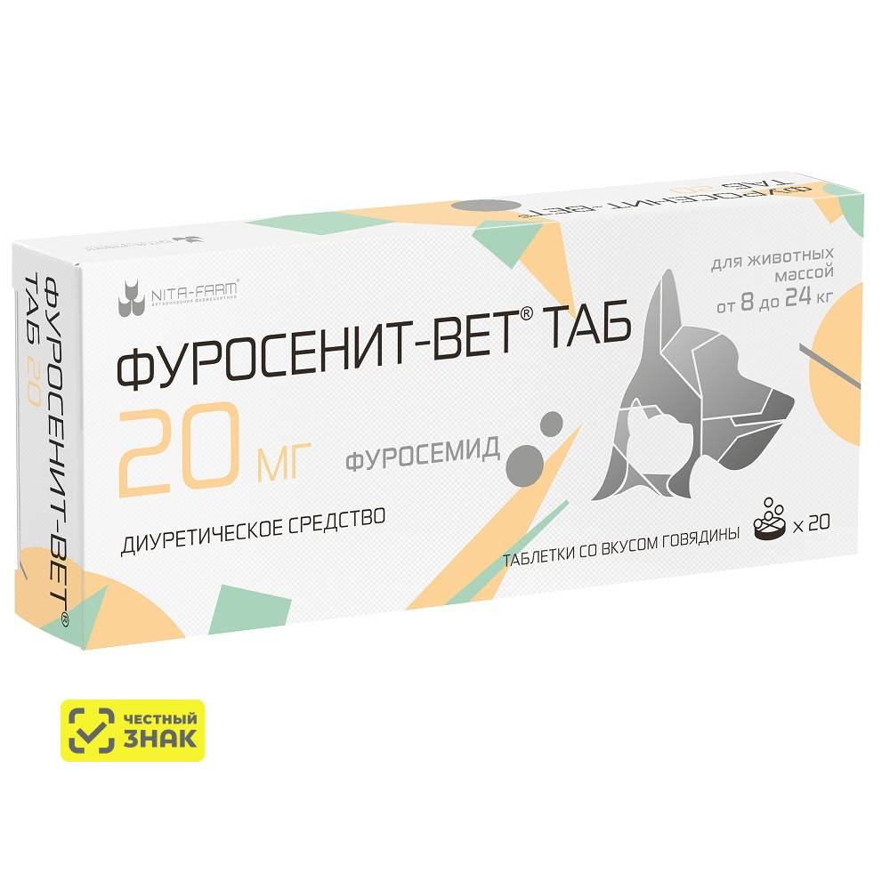 Фуросенит-вет® ТАБ 20 мг содержит в 1 таблетке фуросемида 20 мг.