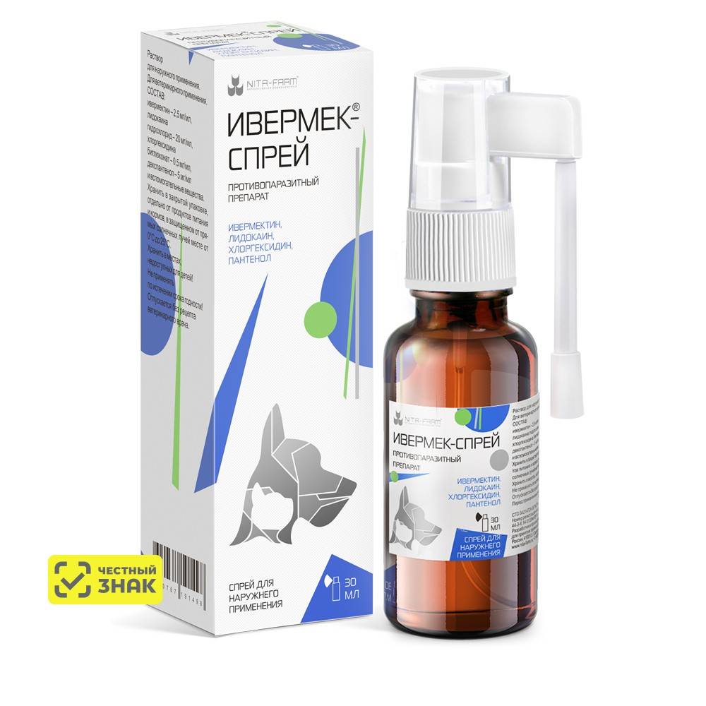 Ивермек-спрей обладает выраженным акарицидным действием на преимагинальные и имагинальные фазы развития саркоптоидных (Sarcoptes spp., Psoroptes spp., Otodectes cynotis, Notoedres cati) и демодекозных (Demodex canis) клещей, паразитирующих у собак, кошек, пушных зверей и грызунов, а также кнемидокоптозных клещей (Knemidocoptes spp.), паразитирующих у птиц. Механизм действия ивермектина, входящего в состав препарата, заключается в его воздействии на величину тока ионов хлора через мембраны нервных и мышечных клеток паразита. Основной мишенью являются глутаматчувствительные хлорные каналы, а также рецепторы гамма-аминомасляной кислоты. Изменение тока ионов хлора нарушает проведение импульсов, что приводит к параличу и гибели паразитов. Вспомогательные компоненты препарата — пантенол и лидокаин оказывают ранозаживляющее и местное анестезирующее действие с выраженным противозудным эффектом, хлоргексидина биглюконат проявляет антибактериальное и противовоспалительное действие. После наружного применения лекарственного средства ивермектин, практически не всасываясь в системный кровоток, в основном накапливается в эпидермисе, волосяных луковицах и сальных железах тела животного, оказывая акарицидное действие в течение 5 – 7 дней. Ивермек-спрей по степени воздействия на организм теплокровных животных относится к малоопасным веществам, в рекомендуемых дозах не оказывает кожнораздражающего и резорбтивно-токсического действия. При попадании в глаза ивермек-спрей вызывает слабое раздражение. Препарат токсичен для рыб и пчел.