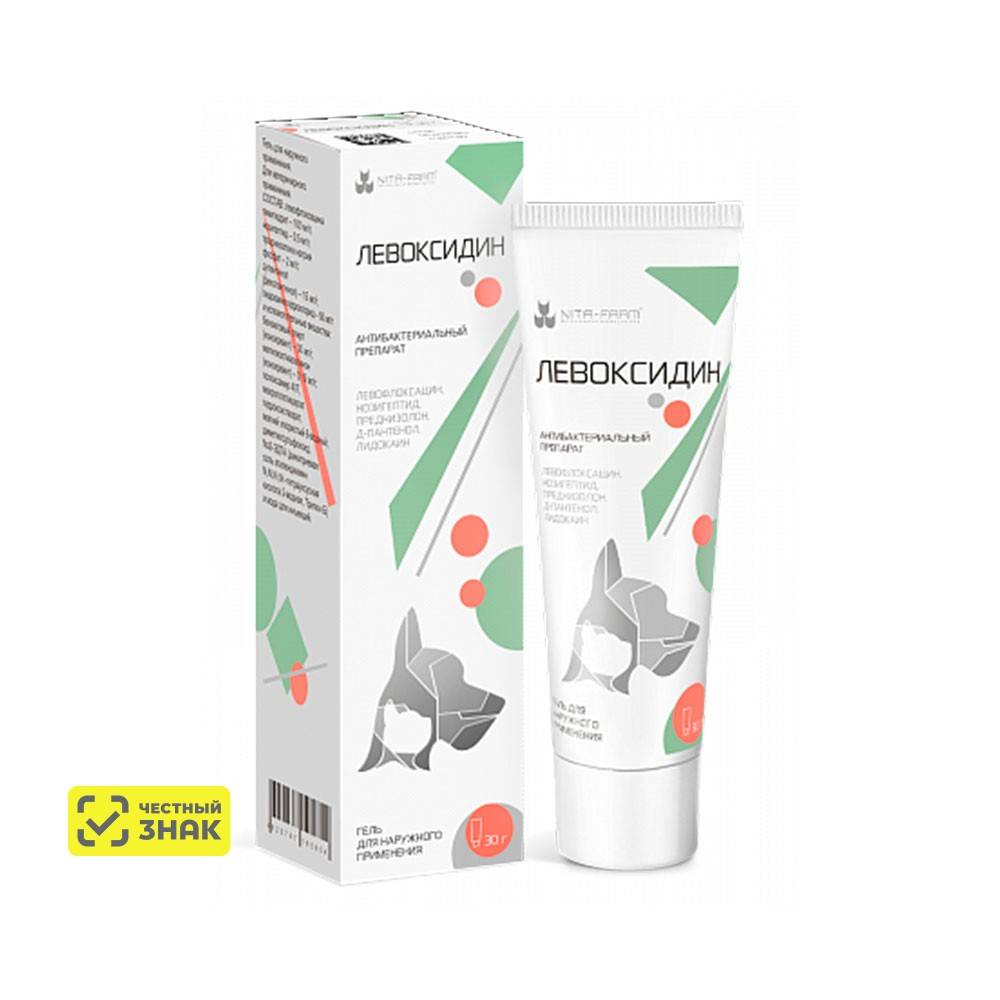 Левоксидин - гель для наружного применения на основе левофлоксацина, нозигептида, преднизолона, Д-пантенола и лидокаина для лечения кошек и собак при воспалительных заболеваниях кожи и мягких тканей, вызванных микроорганизмами чувствительными к левофлоксацину и нозигептиду, в том числе при: дерматите (остром, контактном, атопическом, солнечном), пиодермии (поверхностной, глубокой), терапии ран и абсцессов, флегмон, ожогов, пролежней опрелости, обморожения, для профилактики послеоперационных инфекций после проведения кастраций, купирования хвостов, ушей, наложение швов и т.д., а также при осложнениях вторичной инфекцией.