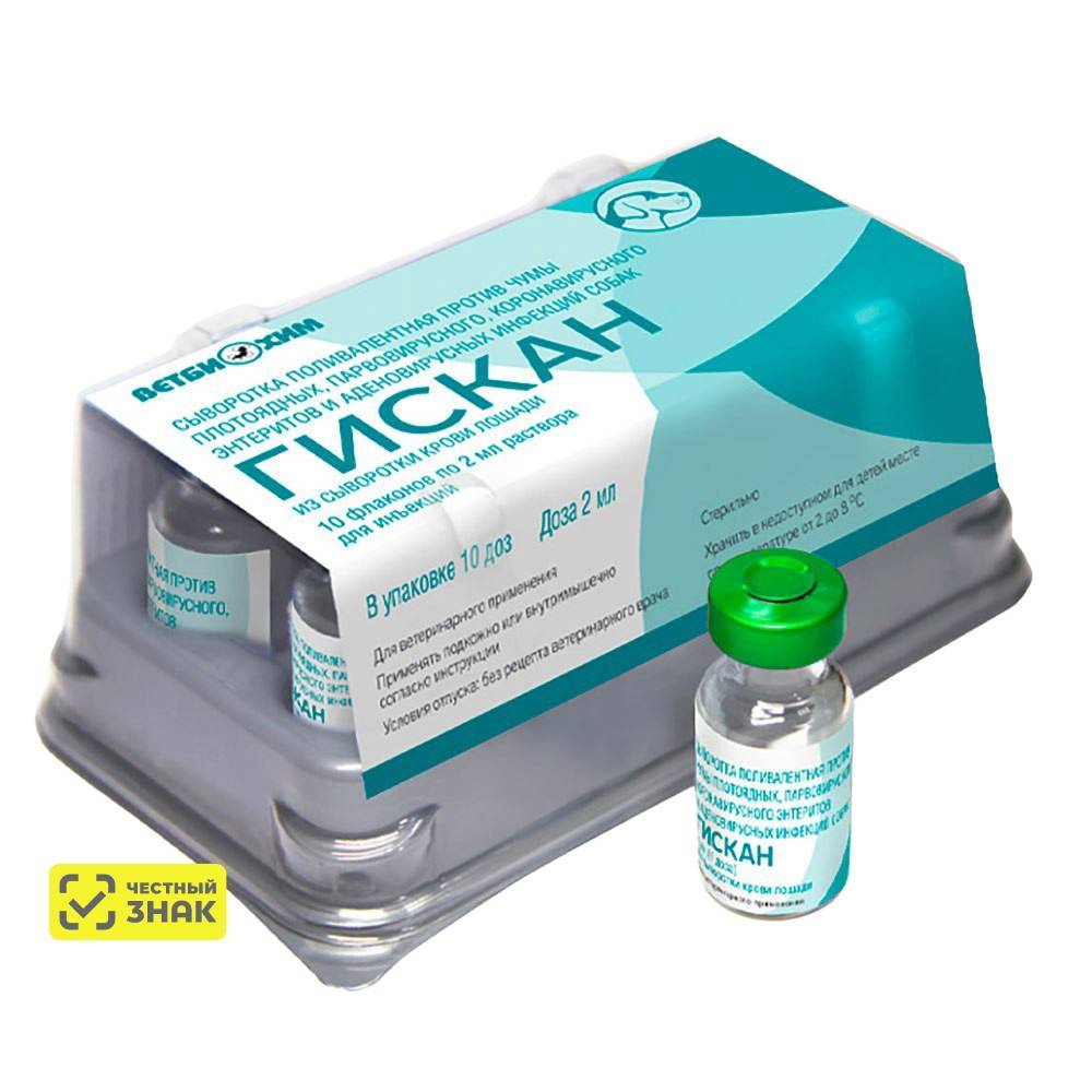 ГИСКАН-5 сыворотка поливалентная против чумы плотоядных, парвовирусного, коронавирусного энтеритов и аденовирусных инфекций собак.