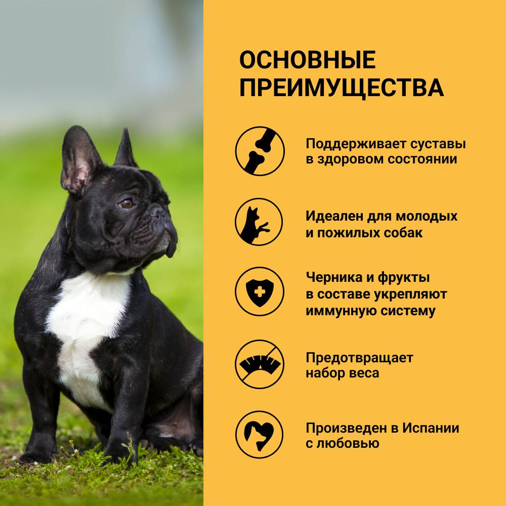 - Сочетание в составе черники, фрукта с высокой питательной ценностью и высокой концентрацией антиоксидантов и витаминов, вместе с нуклеотидами и хорошо усваиваемыми органическими минералами помогает укрепить иммунную систему собаки.