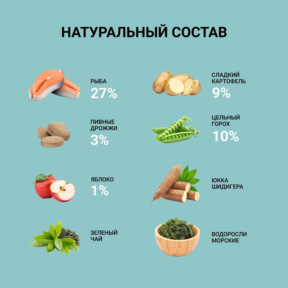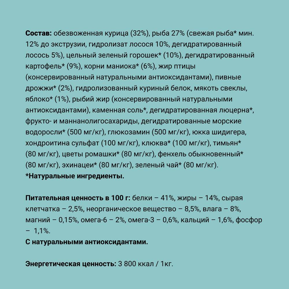 - 12% свежей рыбы гарантирует вкусовую привлекательность для питомца, а общее содержание мяса, мясных и рыбных ингредиентов составляет 65%.