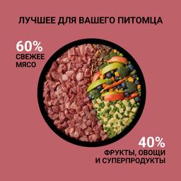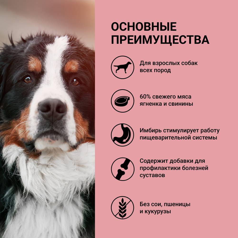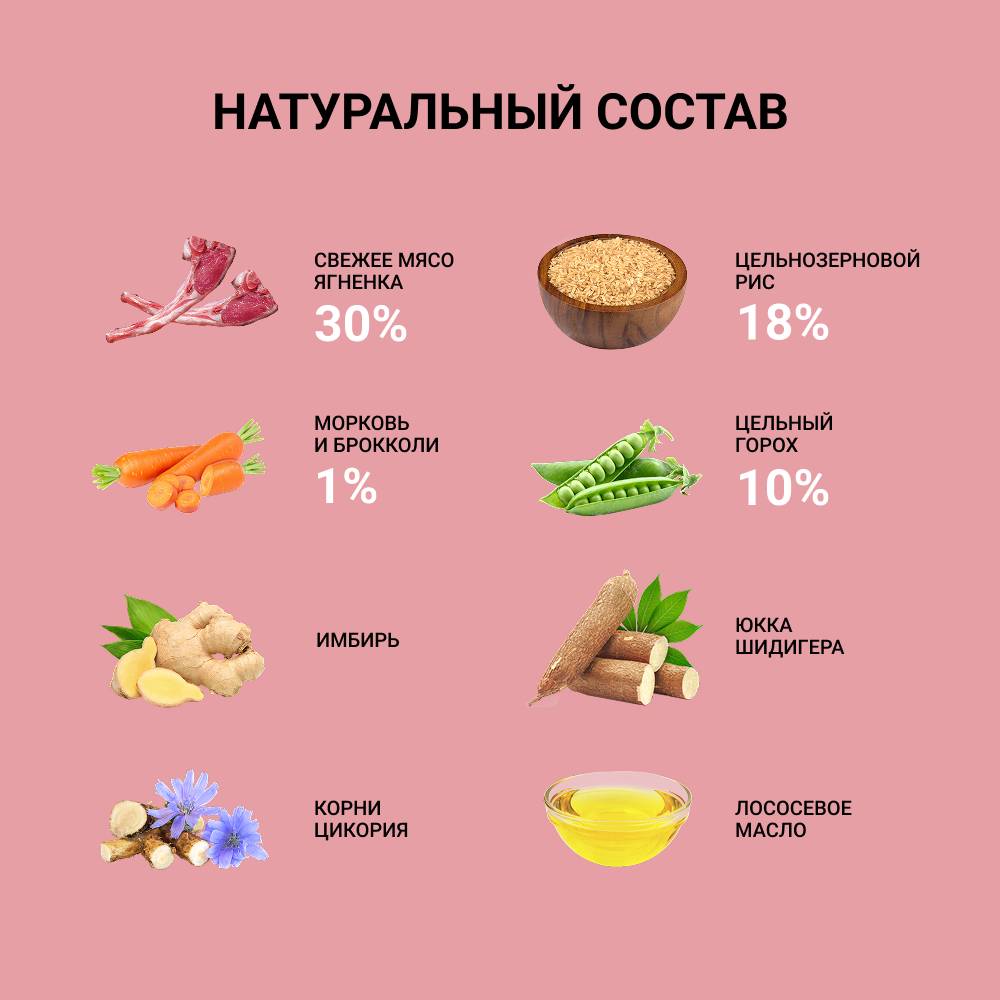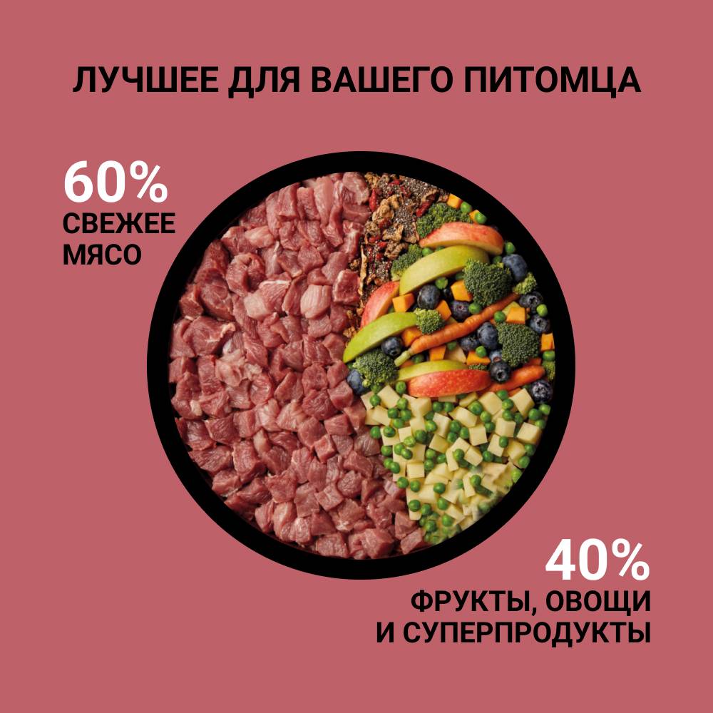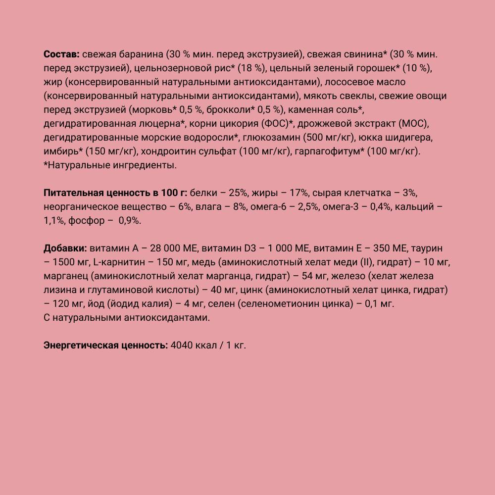 - 60% свежего мяса ягненка и свинины, что обеспечивает исключительный вкус, хорошую усвояемость и максимальную пищевую ценность.