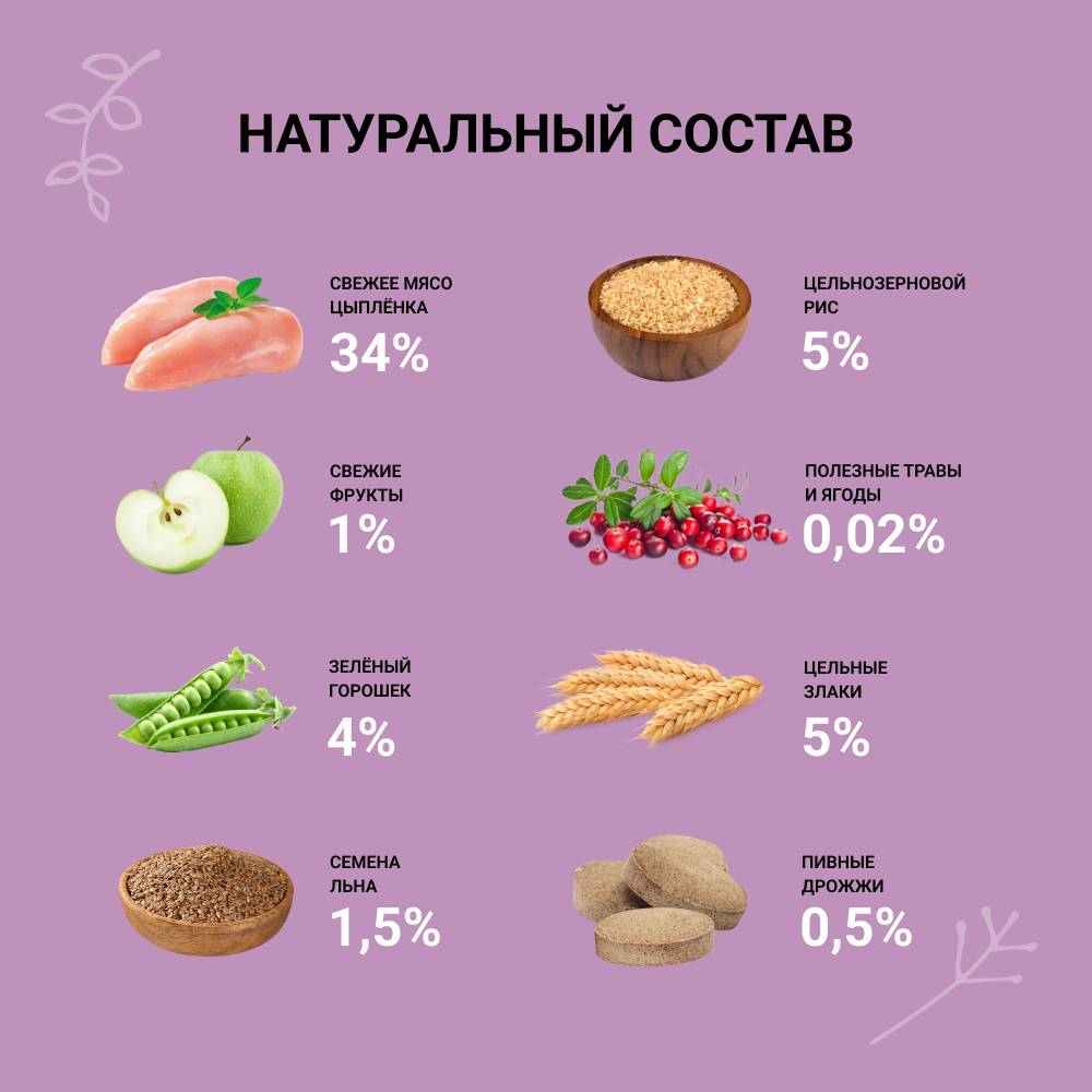 - 10% свежего мяса курицы гарантирует вкусовую привлекательность для питомца, а общее содержание мяса и мясных ингредиентов составляет 34%.