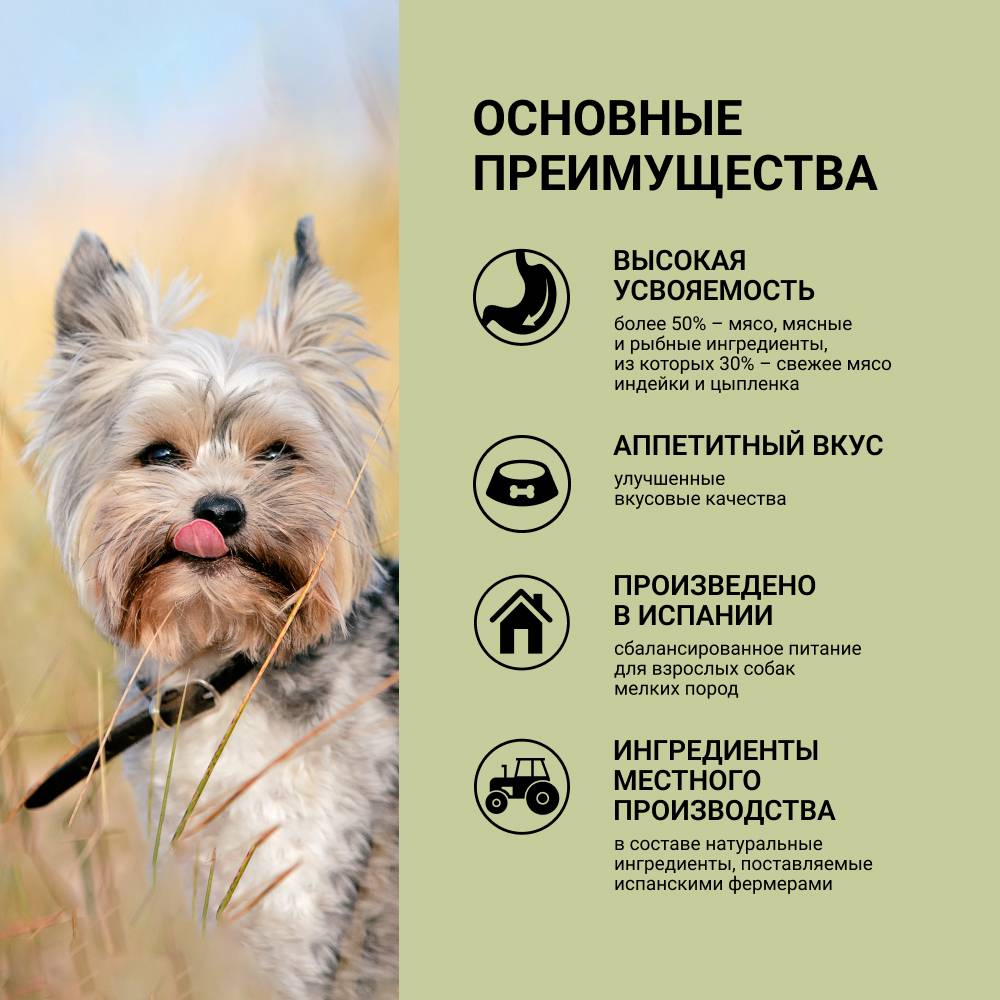 - Сбалансированный по количеству жиров и протеинов корм учитывает особенности развития собак мелких пород, предупреждая набор лишнего веса. Специальная форма и небольшой размер гранул позволяет с лёгкостью наслаждаться приёмом пищи.