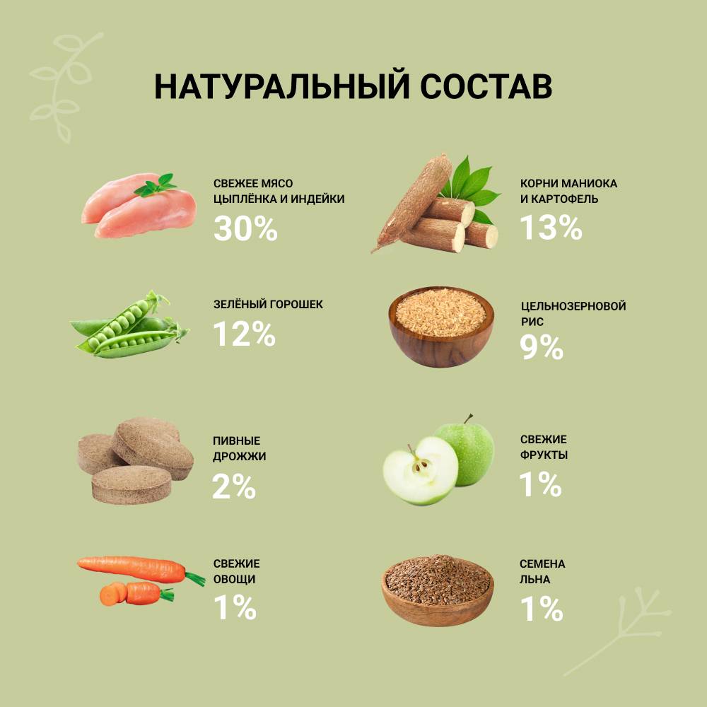 - 30% свежего мяса цыплёнка и индейки гарантирует вкусовую привлекательность для питомца, а общее содержание мяса, мясных и рыбных ингредиентов превышает 50%.