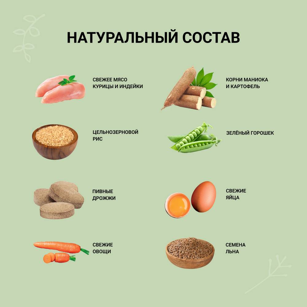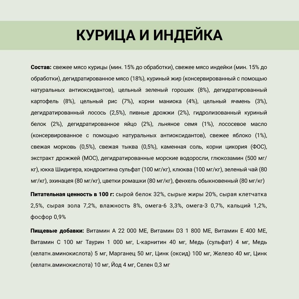 - 30% свежего мяса цыплёнка и индейки гарантирует вкусовую привлекательность для питомца, а общее содержание мяса, мясных и рыбных ингредиентов превышает 50%.