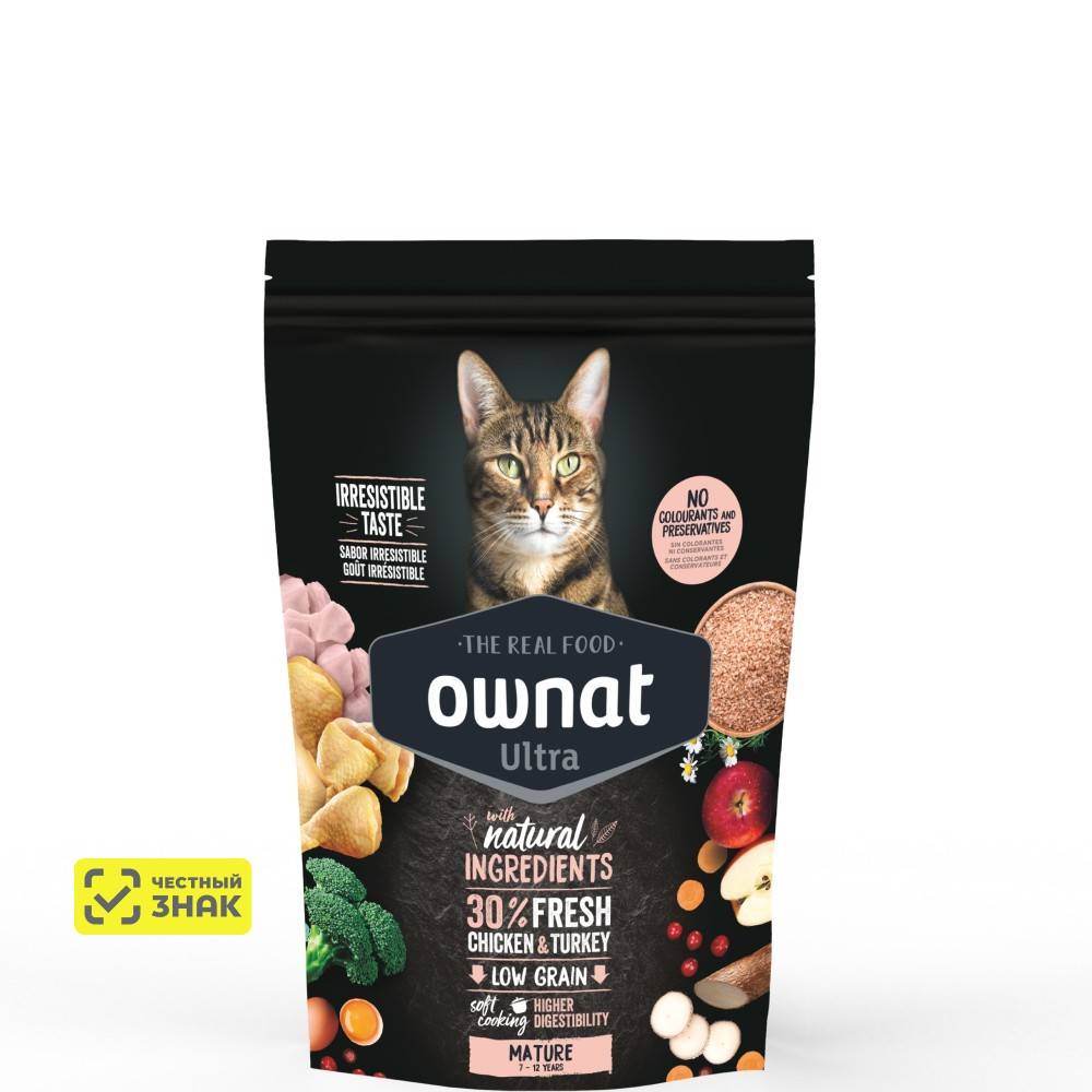 Ownat Ultra Mature - полнорационный, сбалансированный корм, специально разработанный для удовлетворения потребностей в питании взрослой кошки старше 7 лет, любой породы с умеренным или низким уровнем активности.