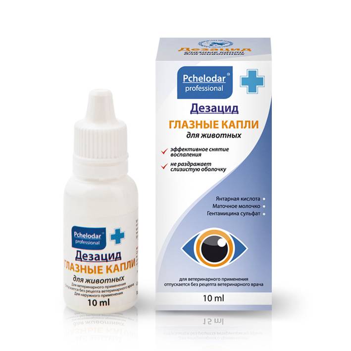 Глазные капли Дезацид применяют для профилактики и лечения острых и хронических заболеваний глазу животных. А также Дезацид используют для профилактики и лечения поверхностных дерматитов области вокруг глаз бактериальной этиологии.