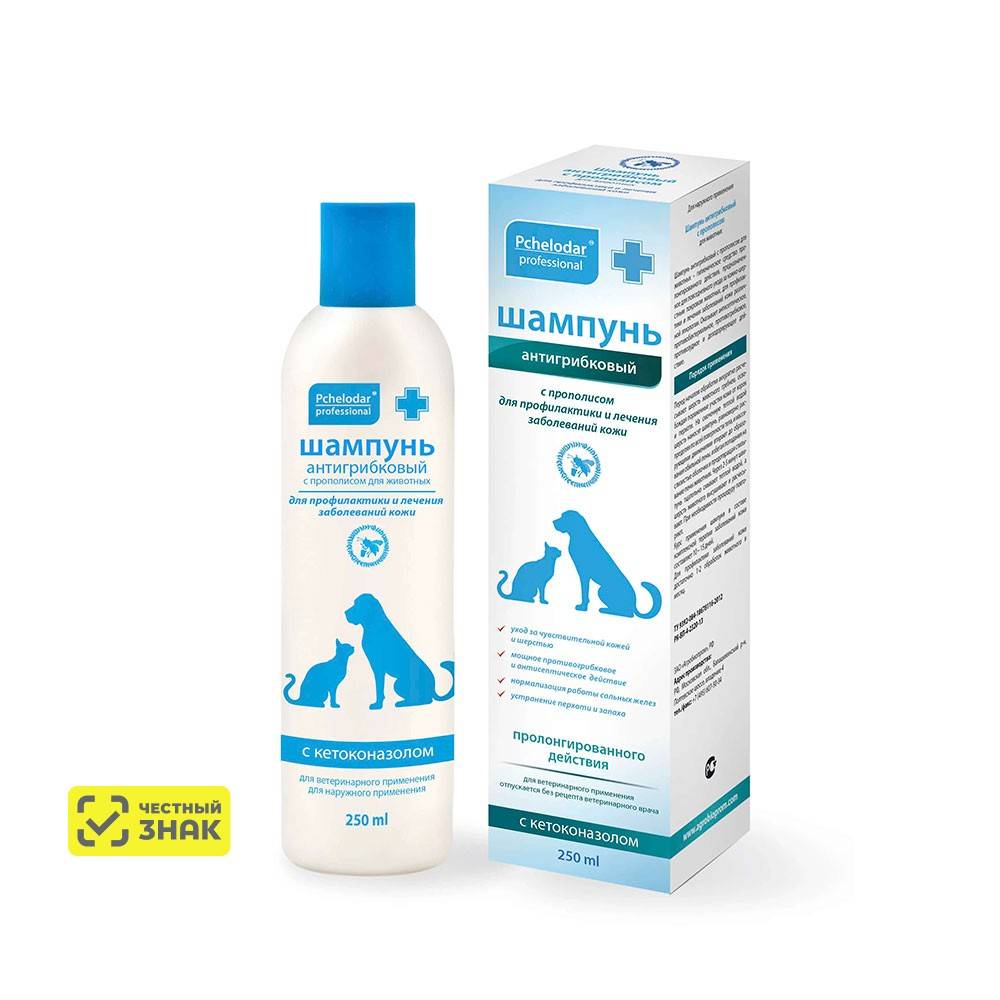 Шампунь Антигрибковый с кетононазолом, пироктон оламином и экстрактом прополиса предназначен для профилактики и лечения заболеваний кожи животных. Кетоконазол и пироктон оламин оказывают длительное противогрибковое и противобактериальное действие, активены в отношении микроорганизмов (Trichophyton mentagrophytes, Trichophyton rubrum, Trichophyton verrucosum, Microsporum canis, Microsporum gypseum и других, бактерий E.coli, Salmonella spp., Proteus spp., Klebsiella spp., Enterobacteriacae spp. и Pseudomonas aeruginosa), дрожжей (Candida spp., и Malassezia spp.,) и диморфных грибов. Экстракт прополиса препятствует размножению бактерий, обладает выраженным фунгицидным (противогрибковым), противовоспалительным, противозудным и ранозаживляющим действием.