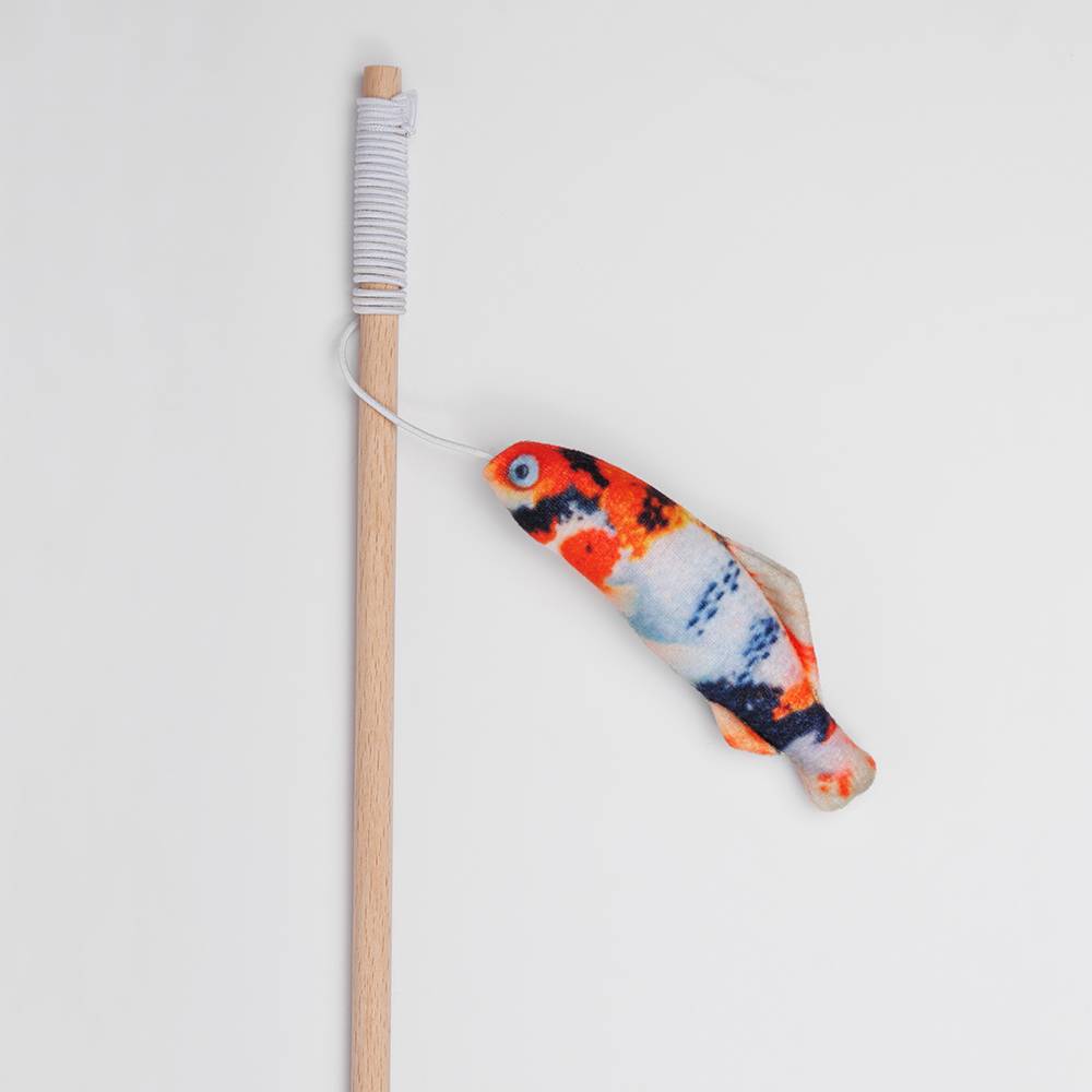 - На удочке есть игрушка-рыбка с погремушкой и натуральными ароматическими добавками (валериана, кошачья мята) для привлечения внимания питомца.