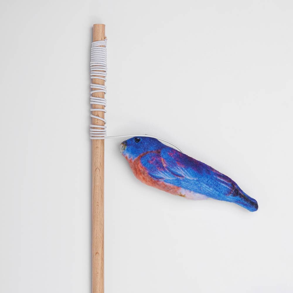 - На удочке есть игрушка птичка с погремушкой и натуральными ароматическими добавками (валериана, кошачья мята) для привлечения внимания питомца.