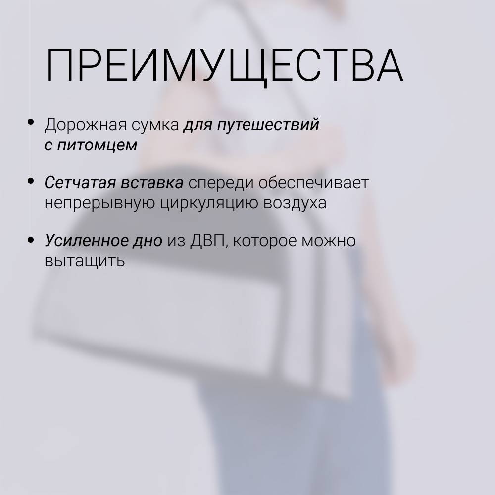 • Дорожная сумка подходит для путешествий с питомцем в машине, общественном транспорте, на самолете и в поезде.