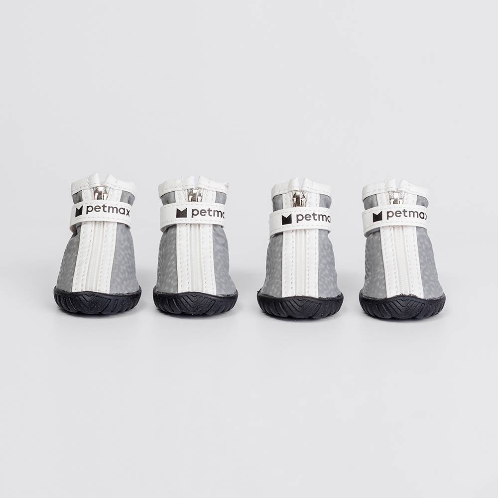 хорошо держатся на лапе, плотная подошва, молния спереди легко надевать.
