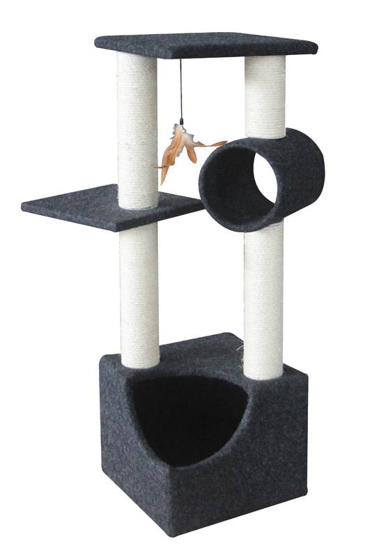Petmax Дом-когтеточка для кошек 35x35x105 см, серая - стильная и интересная когтеточка для питомцев. Уютный домик прекрасно удовлетворит потребность питомца в отдыхе, а сизалевые столбики будут эффективно помогать кошке стачивать когти. В комплект входит помпон с перьями для игр.