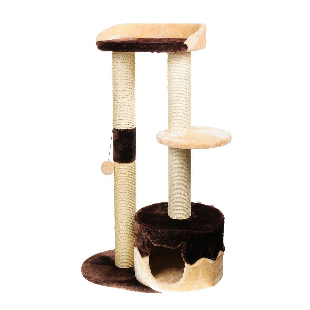 PETMAX Дом-когтеточка REBECCA 50х37х100 см бежево-коричневого цвета – это целый развлекательный комплекс для домашнего питомца. Он имеет несколько ярусов для игр и отдыха, уютный домик, в котором можно спрятаться, а также 2 когтеточки, которые принесут пользу и удовольствие коту, а также уберегут мебель в доме. Дополнена конструкция мягким шариком на веревке, который так и манит поиграть с ним.