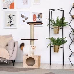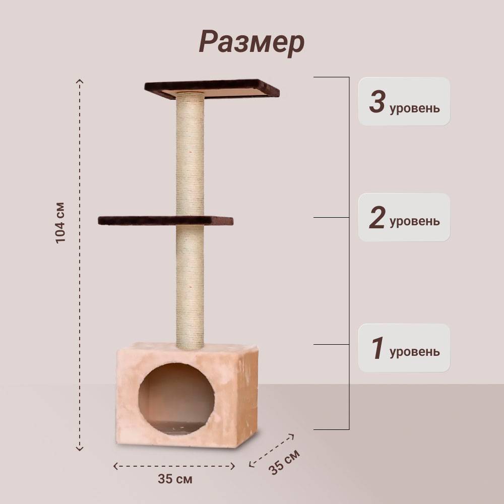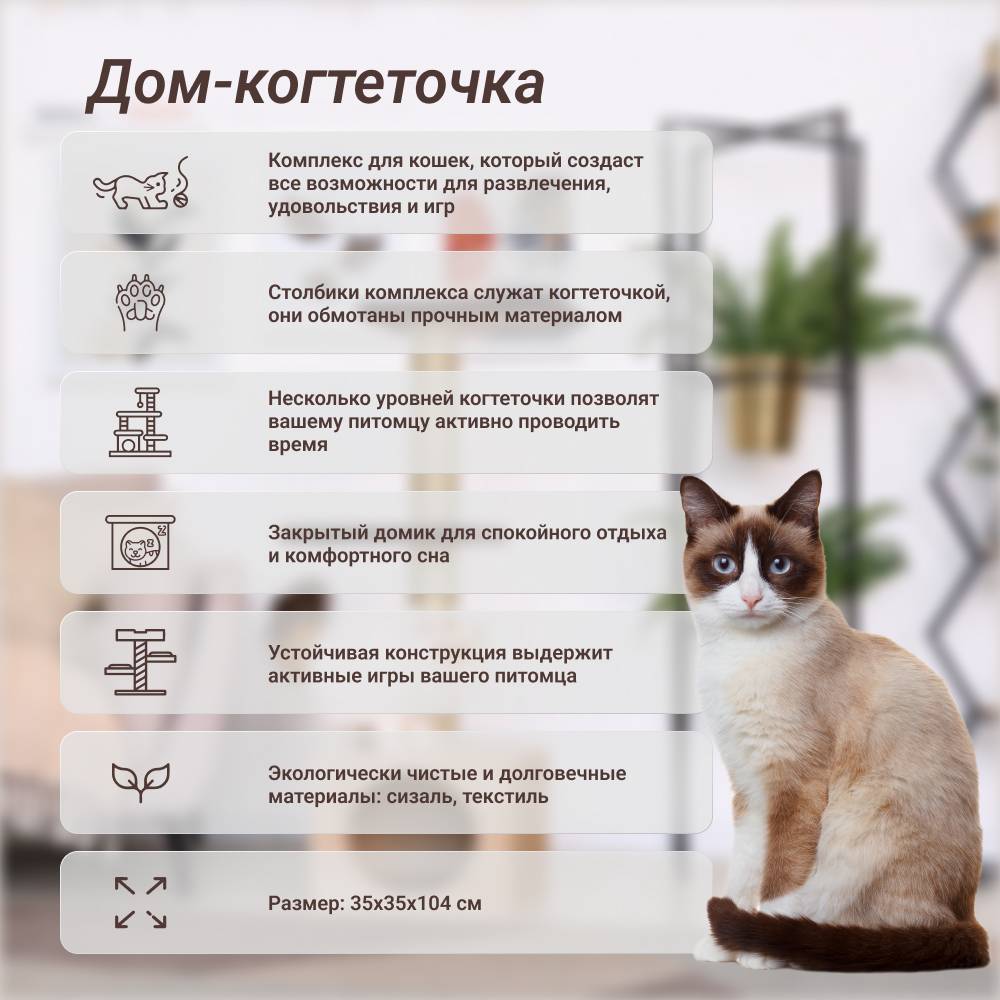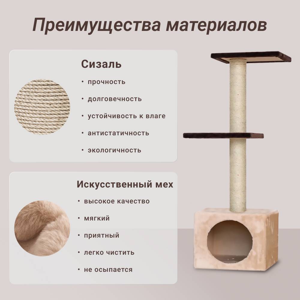 - Несколько уровней когтеточки позволят вашему питомцу активно проводить время, совершая прыжки. Закрытый домик для спокойного отдыха и комфортного сна.