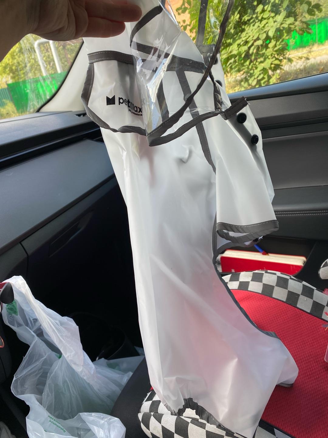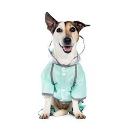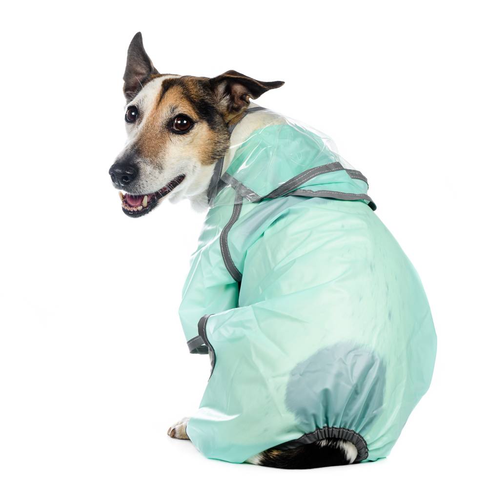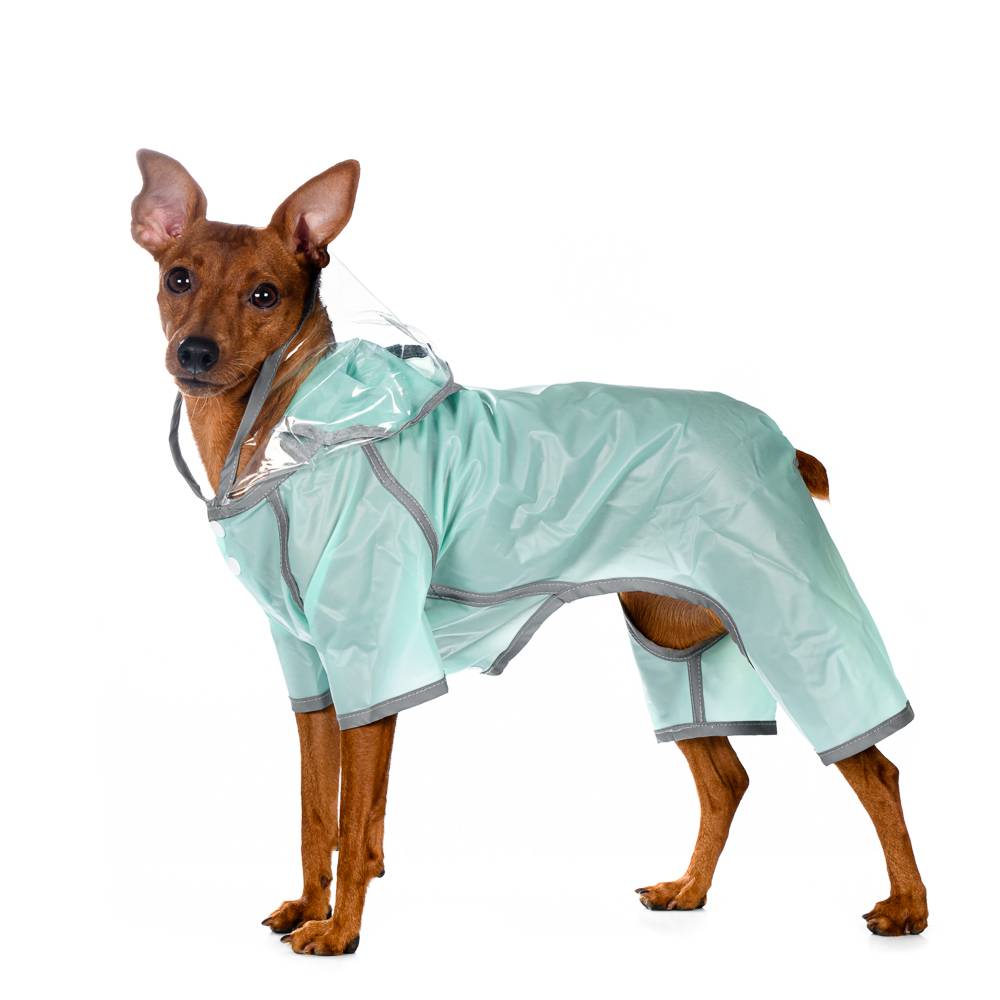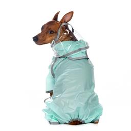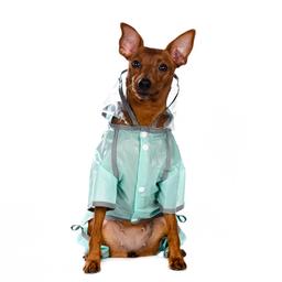 Дождевик из легкой водонепроницаемой ткани с длинными рукавчиками, капюшоном и удобными кнопками-застежками подходит для ношения в дождливую погоду. Надежно защитит питомца от влаги и грязи.