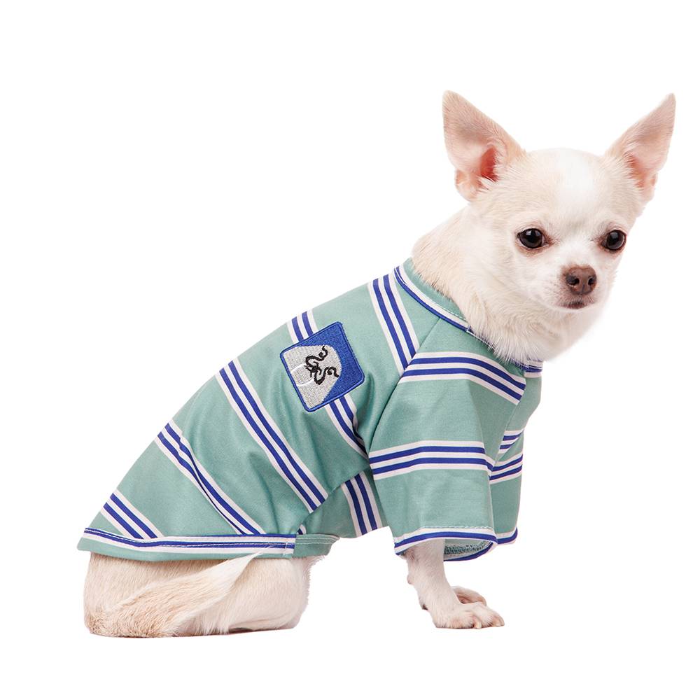 Зеленая футболка с полосками подходит для повседневного ношения, праздничных мероприятий и для проведения фотосессий. Футболка защитит питомца от палящего солнца в яркий солнечный день, поможет комфортно себя чувствовать в прохладные дни.