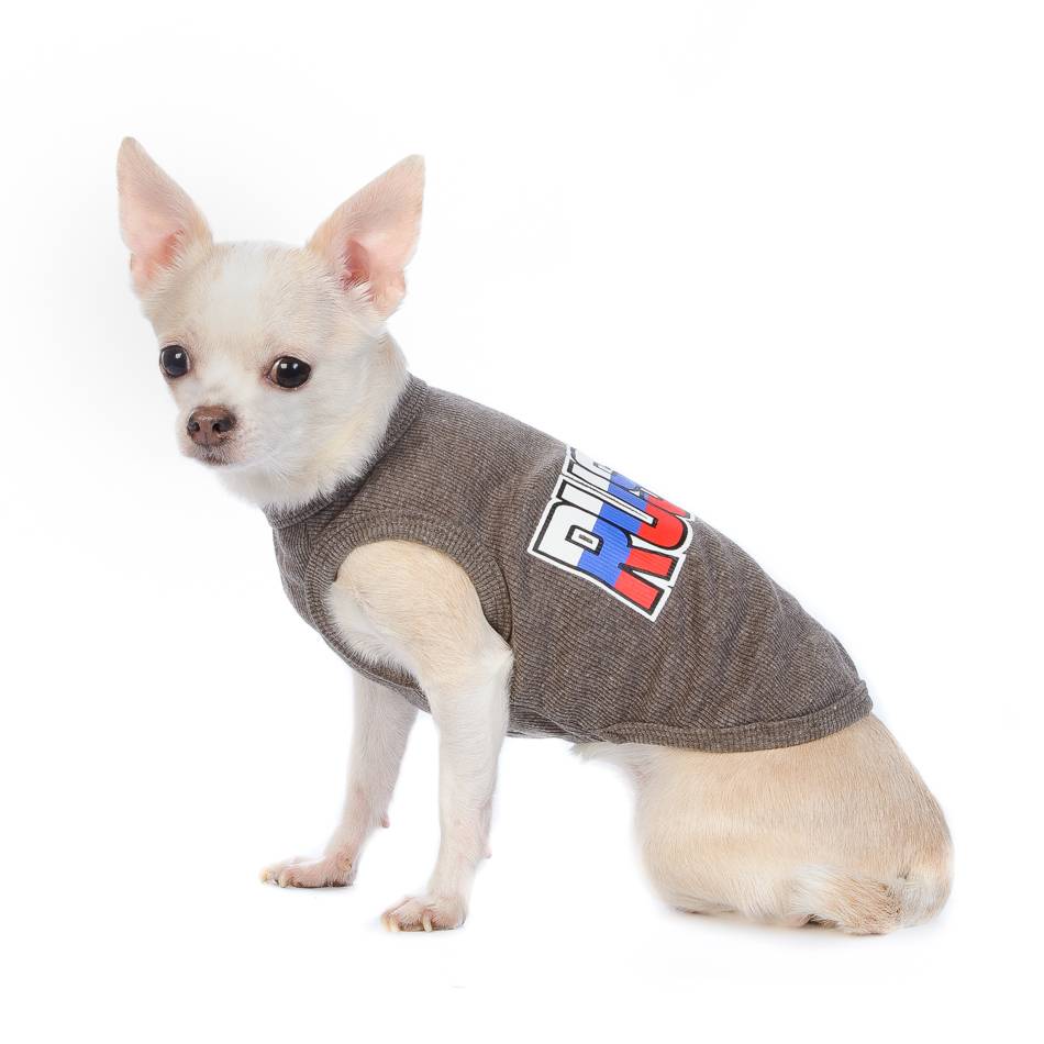 Petmax представляет новую весенне-летнюю коллекцию одежды для собак. Яркая футболка серого цвета с патриотичной надписью на спине - практичный и стильный аксессуар, который подойдет как для повседневного ношения, так и для проведения фотосессии.