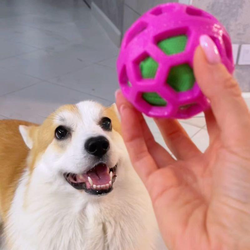 Отличный мячик, очень прыгучий, мягкий силикон, собаке нравится его грызть. Внутри мячика шуршалка и пищалка, что добавляет интереса в игре