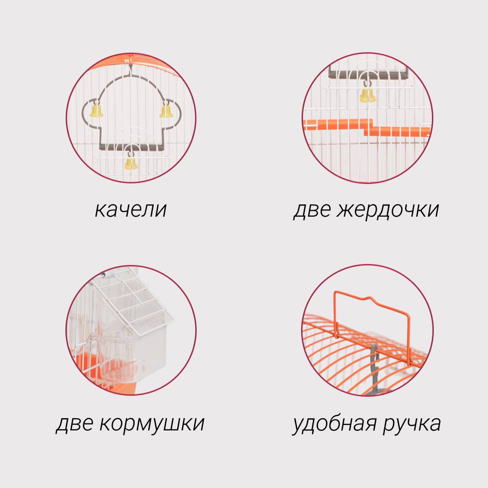 - В комплекте навесные пластиковые качели, 2 пластиковые жердочки, 2 навесные пластиковые кормушки, поилка.