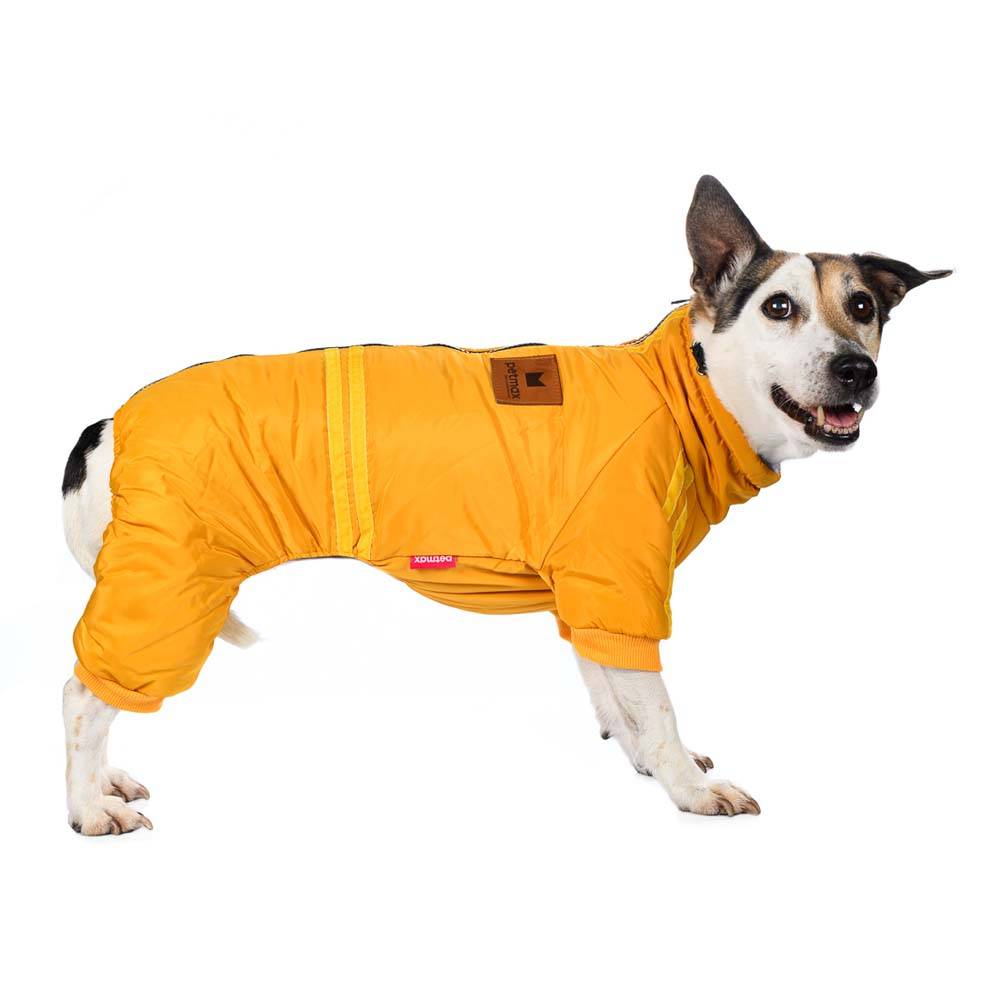 Комбинезон желтый на молнии с полосками из новой коллекции Petmax – практичный повседневный костюм для прогулок холодными зимними днями.