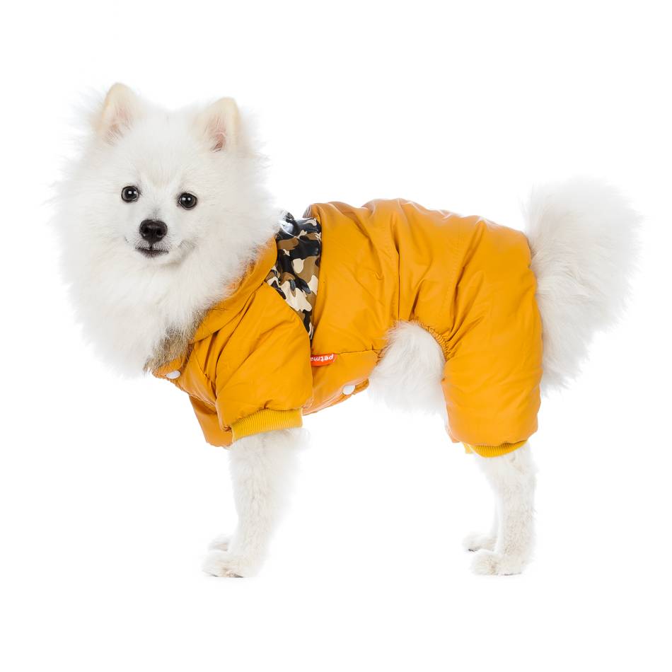 Petmax Комбинезон желтый с капюшоном удобный плотный комбинезон для прогулок в холодную погоду. Плотная ткань верха защитит от ветра, теплая подкладка обеспечит тепло. Мягкий капюшон из уютной мягкой ткани согреет шею и голову питомца. Стильные детали: контрастные вставки на спинке, пристегивающийся капюшон - придают комбинезону игривый и модный вид. Приобретая одежду для собак, вы прежде всего, заботитесь об их здоровье, поэтому важно одевать собак по погоде и постараться приучить их к обуви, которая защитит лапы не только от холода, но и от реагентов.