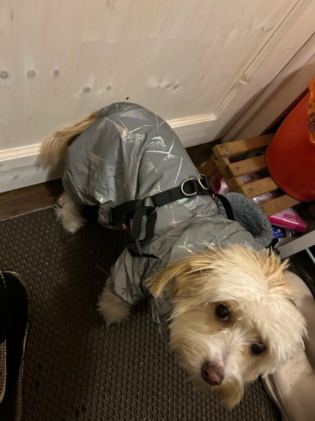 - Застегивается на животе на кнопки – отличный вариант для длинношерстных собак.