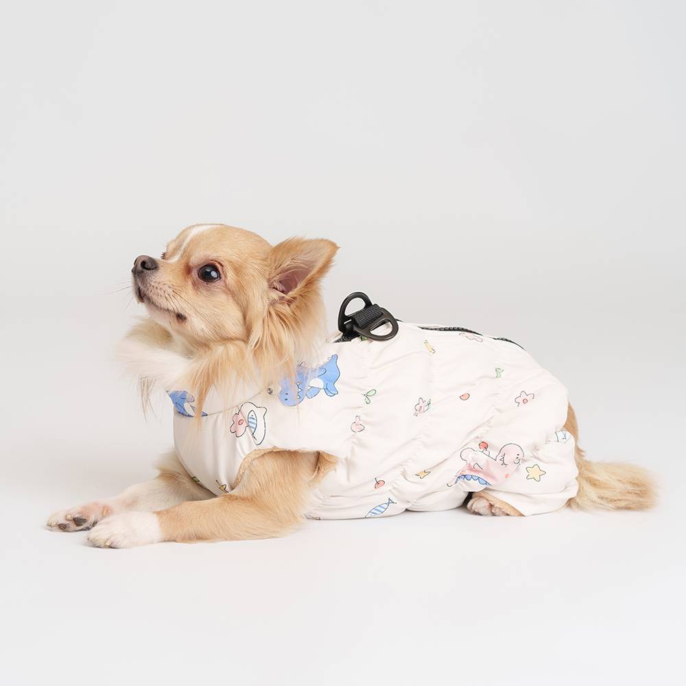 - Резинка на животе для удобной посадки комбинезона на теле собаки.