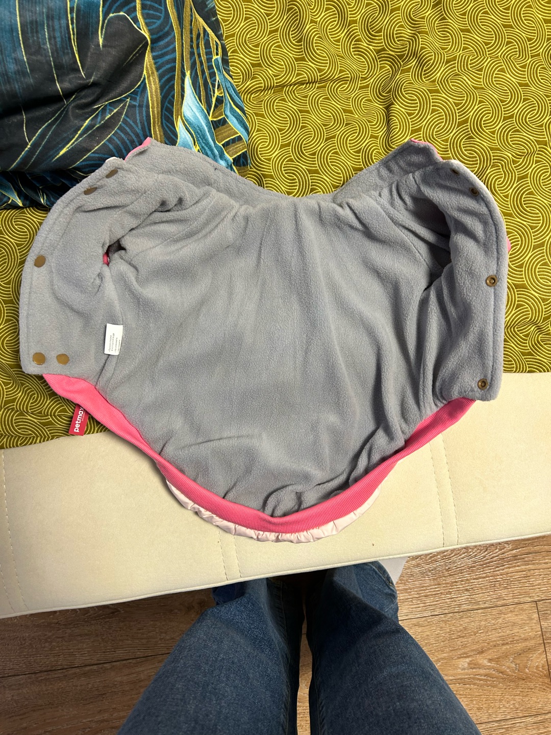 Курточка легкая, достаточно теплая, хорошо сидит на щенке, хотя брали на размер больше, чтобы под курточку надеть шлейку. На спинке есть молния, она декоративная, но позволяет сделать отверстие под карабин поводка и при необходимости закрывать его.
