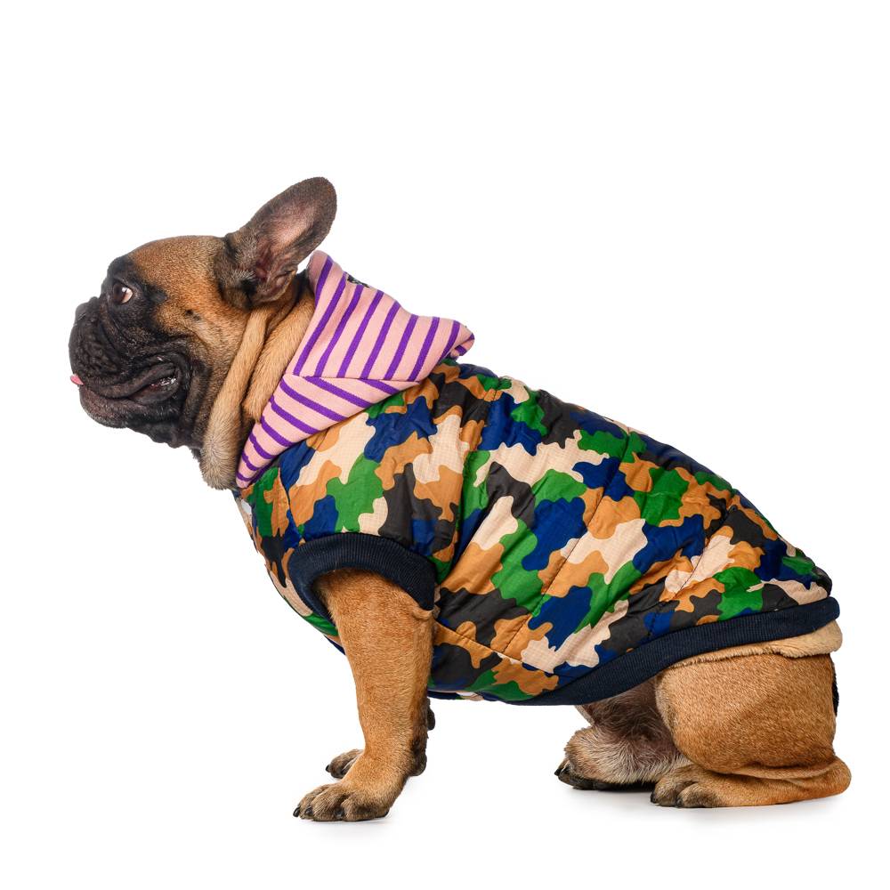 Куртка с капюшоном для собак с камуфляжным рисунком зеленого цвета из новой коллекции от бренда Petmax. Одежда для собак от Petmax - это качественные, модные изделия, которые подойдут любой собаке.